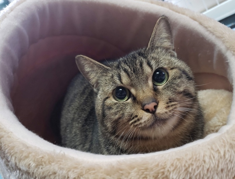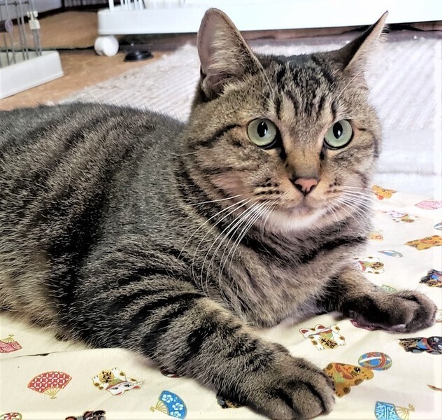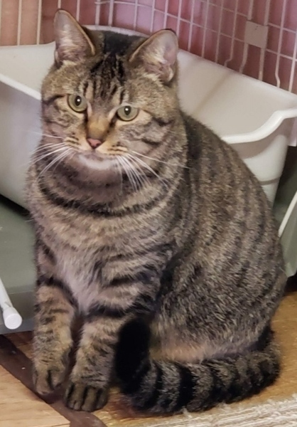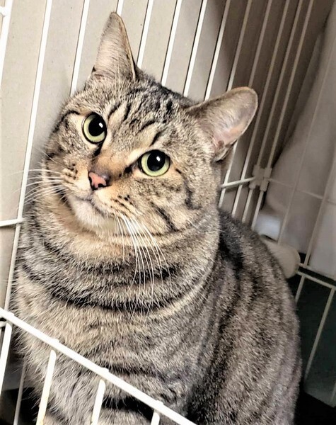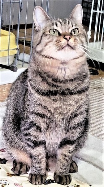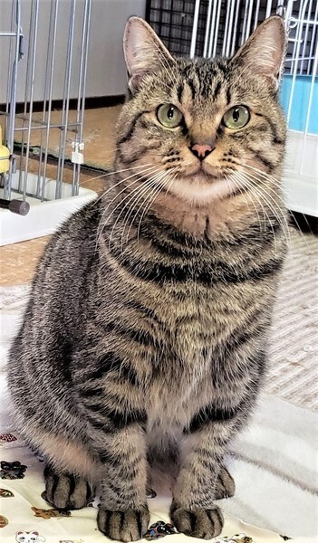 | 特徴(性格など) | 仮名: まるこ(メス) 毛色: キジトラ 性格: まるこちゃんは名前の通り、まん丸でとても大人しい女の子です。控えめに周りを観察していますが、実は遊ぶのが大好きなようです。 猫じゃらしなどで遊んであげるのはとても喜びます。 自分からは積極的には行けないタイプですが、他の猫が来たら遊ぶ事が出来、友好的です。ご飯のおねだりも控えめで、お皿の前でじっと待っています。 ウェットフードは大好きなので、取り出すと、とても可愛い声で少しだけにゃーんと言います。ちょっとビビリですが、慣れればとても素直で飼いやすい子だと思います。 |