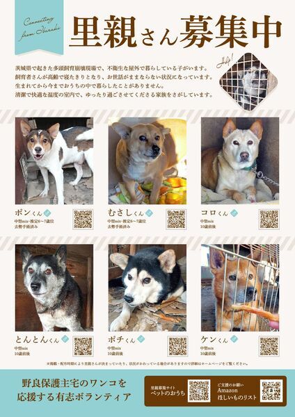 | 里親募集する理由 | 飼育者さんが高齢で、お世話がままならない状況です。 発覚当初は狭い檻に分けて50頭ほど飼育されていました。徐々に里親さんが決まり現在は2頭になっています。 また、近所の親類の家族も犬を多頭(4頭)を飼育しておりお世話が行き届いていません。 まだ屋外飼育の現地で生活しているため、早めに室内で生活をさせてあげたいと思っています。 |
