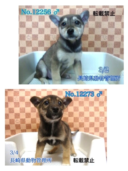 | 特徴(性格など) | 〜3/16追記〜 No.12273 茶黒色の子は譲渡になりました まだよちよち歩きの生後2ヶ月位、可愛い可愛い雑種の子犬、男の子2匹ですฅ•ﻌ•ฅ 長崎県雲仙市瑞穂町にて捨てられており、3/2、3/4にそれぞれ長崎県動物管理所へ収容されてきました。寂しく助けを待っています! まだまだ幼い為、長時間のお留守番は出来ません。頻回に離乳食を小分けにして与える事が可能な方、排泄も頻回なので育てる自信と理解、覚悟のある方、飼育経験のある方 が望ましいですm(_ _)m 収容当初は怯えていましたが今は尻尾フリフリ寄ってきてとても可愛いですฅ•ﻌ•ฅ♡ 子犬らしさ全開に仲良く遊んだりじゃれあったりとやんちゃに過ごし、疲れたらくっついてスヤスヤと眠っておりますฅ•ﻌ•ฅ♡ 優しい職員さん方が忙しい中、怖くないよ、幸せになれます様にと毎日触れ合いながら、一生懸命にお世話してくださっています。 当分の間はかなり手がかかり大変かと思いますがまだ子犬ですし、人間が愛情をもって長い目で接すれば、この子達ならきっとじきに新しい家庭環境に馴染んでいけると思います(^^) ⭐️必ず室内飼育で、譲渡後に速やかな病院受診、混合ワクチン接種、ノミダニやフィラリア予防、シャンプー、適期に不妊(去勢)手術をする事が可能な方。 ⭐️まだまだ幼い為長時間のお留守番は出来ません。しばらくは頻回に離乳食を与える必要があります。なるべくお留守番の少ない、沢山優しく触れ合って頂けるご家庭。 ⭐️トイレの躾は1からとなります。まだ子犬なので躾は入りやすいと思われますm(_ _)m 最初は何かと手がかかり大変ですが覚悟と理解で受け入れて下さる方。 ⭐️犬の飼育経験があり愛情を持って犬をしっかり躾することが出来る方、お散歩や運動に充分時間をあてられる方、場合によりトレーニング教室なども視野に入れて考えてくださる方。何卒宜しくお願い致します。 ⭐️優しい先住犬が居るご家庭大歓迎です。 ⭐️親犬不明の為どの位の大きさになるか分かりませんが、中型〜大きめの中型犬程度に成長すると思われます。 以上の点を踏まえ、この子達の置かれた状況、辛い過去もご理解のうえ、全て受け入れ寄り添っていただけるご家庭で可愛がっていただきたいと祈っております。収容されている全ての子は身勝手な人間による被害者であり、何も悪くありません( ; ; ) 家族の一員として生涯大切にしてくださる優しいご家庭とのご縁が結ばれ幸せになれます様に♡ 1日も早く温かな愛情を目一杯注がれながら、元気に幸せに生きてほしいです。人間より遙かに短い生涯です。 冷たく硬いコンクリートの上、檻の中で、命の期限が迫る中、ひたすら優しい素敵な里親様を待ち続けています。 悲しい事にこの世の中、人間に飼われないと犬は生きていく事が出来ません。 捨てる飼い主、探さない飼い主、医療にかけない飼い主、虐待する飼い主…飼い主を選ぶ事も出来ません。 まだまだこれからのこの子達を、生涯大切に可愛がって下さる優しい素敵な里親様、どうかお願い致します。きっと、必ず最高の家族になります! もうこれ以上悲しい辛い目に遭わせたくありません。本当の愛情、温もりを知ってほしい、辛かった分、寂しかった分、まだまだこれからの犬生はのびのびと幸せいっぱいに愛し愛されて、生きてほしいと願っております。家族の一員に迎え、愛ある温かなお家で、これからの生涯を共に暮らして頂けませんか。 何卒宜しくお願い致します(๑•ᴗ•๑)♡ ◆健康状態 食欲旺盛です。 ※管理所では収容するのみ、になり、健康診断やワクチンなどは一切行っておりません。 収容動物の健康面の保証、及びトライアルは無い為、例えどんな病があろうとも全てを受け止め丸ごと受け入れて下さる方、終生愛情飼養して下さる方のみ への譲渡となります事をご理解、ご了承の程何卒宜しくお願い申し上げますm(_ _)m ※譲渡後は必ず速やかに病院でメディカルチェック(血液検査、便検査、混合ワクチン、ノミダニ・フィラリア予防やシャンプー等)適期での不妊手術を確実にお願い致します。 ★去勢、避妊手術、室内飼育は長崎県動物管理所より譲渡条件の1つになります。 ※脱走にはくれぐれもご注意願います。 ※大きな物音にビックリして逃げ出した、 ※急に走り出してリードから手を離してしまった、 ※首輪や胴輪が抜けてしまった、 ※一瞬の隙をついて開いたドアの隙間から飛び出して行ってしまった、 というケースもございます( ; ; ) 交通事故等、命に関わります! 細心の注意を払い、たすき掛けやダブル、トリプルリードで、 言葉を持たない大事な家族を守る為に、首輪、胴輪には必ず迷子札、鑑札をつけてくださいm(_ _)m https://wanchan.jp/osusume/detail/2395 http://psnews.jp/dog/p/45558/ https://light-comes-in.jp/dog-doublelead/ ⭐︎管理所にてドロンタールプラス(犬に寄生する犬回虫、犬鉤虫、犬鞭虫、瓜実条虫を駆除するお薬)と、 ノミマダニ駆虫のネクスガード投与済み