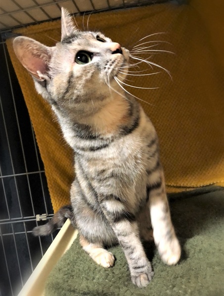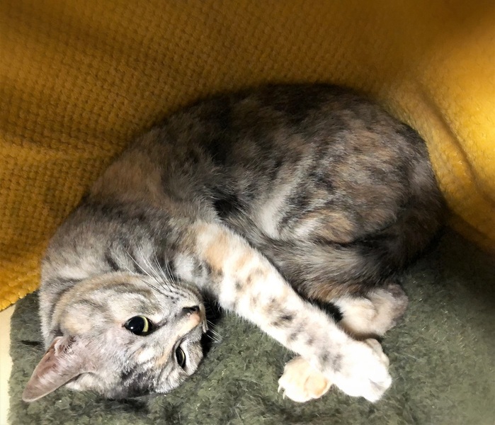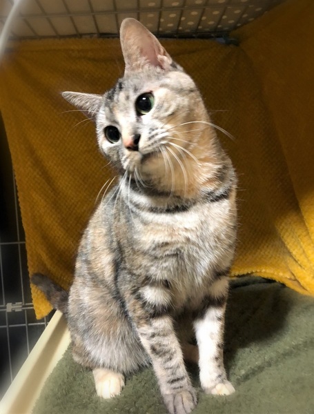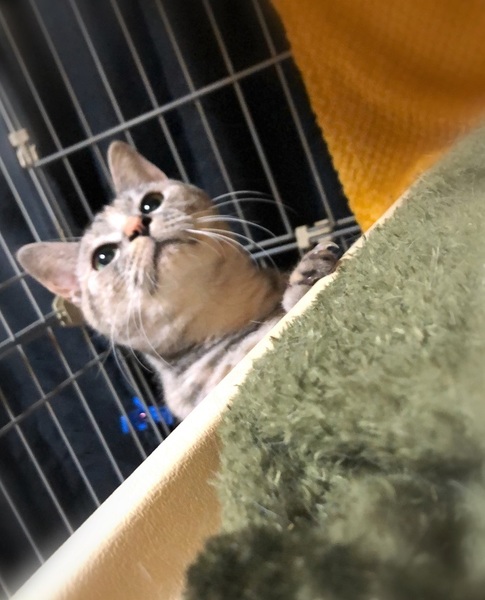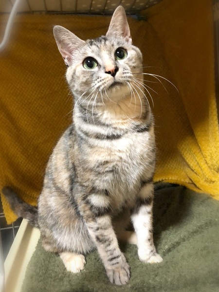 | 特徴(性格など) | 仮名、ねこ子 淡いグレー+さび・奇麗な色の女の子。 環境に慣れるまで時間が必要です。 今はケージ+一部屋で、気が向くと自分で遊びにやって来て→眠い時・びっくりした時はケージに戻って行きます。 抱っこは緊張で石になりますが、お尻トントンと撫でられる事が好きでふみふみを始めます。 遊ぶ事も好きで、猫じゃらしを一生懸命追いかけます。 |