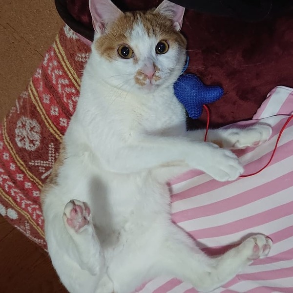 | 特徴(性格など) | 白多め茶白。しっぽ まっすぐ長い。 甘えん坊、食いしん坊。子猫のように遊びたい。好奇心旺盛。人が大好き、他の猫も大好き。 性格は 花丸君です。 |