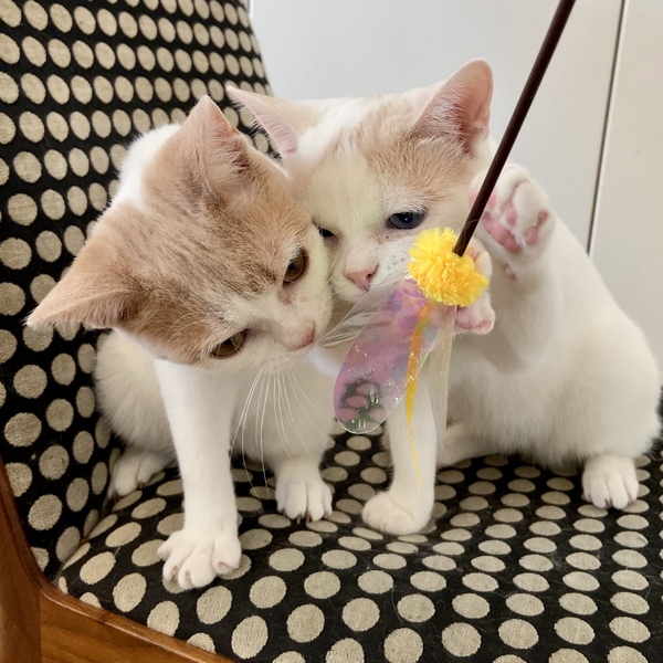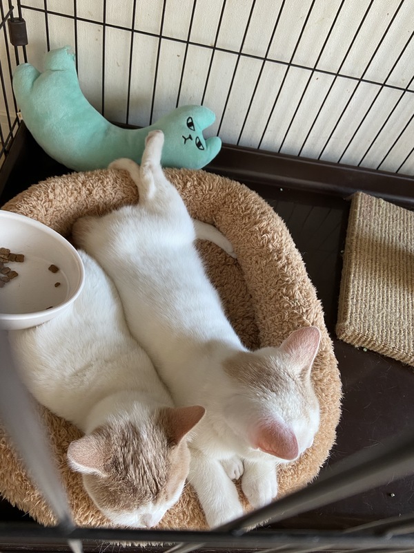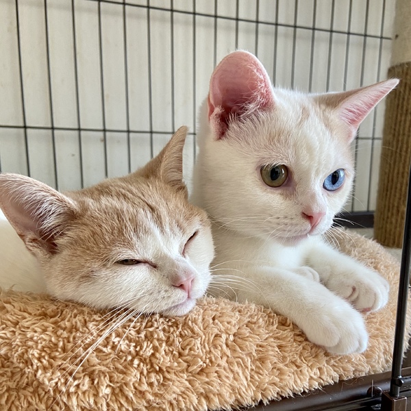 | 特徴(性格など) | チャタマ:頭が茶色が多い シロタマ:頭が白が多い、オッドアイ 2匹とも尻尾が長くまっすぐです お預かり当初食が細く軟便で痩せていましたが現在は食欲旺盛です。 シュシュをつけていて痒かったのかしきりに掻いていたのでまだ少し首回りに跡があります。 抱っこも爪切りも大丈夫ですが、お風呂に入れた際には大暴れしました。 健康状態とても健康で元気です 目やにや涙が出てることがありますがウェットティッシュで優しく拭いてあげるくらいで涙やけができたり目薬が必要なほどではありません。 まだ子猫故に体調の急変もあり得ます。 2回目ワクチン後のお届けを予定しております。 ウイルス検査(エイズ・白血病)陰性 ワクチン(1回) 駆虫 検便 シャンプー 爪切り |