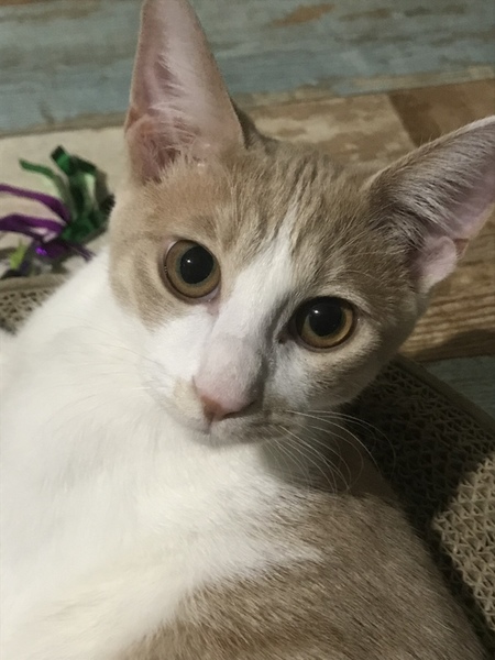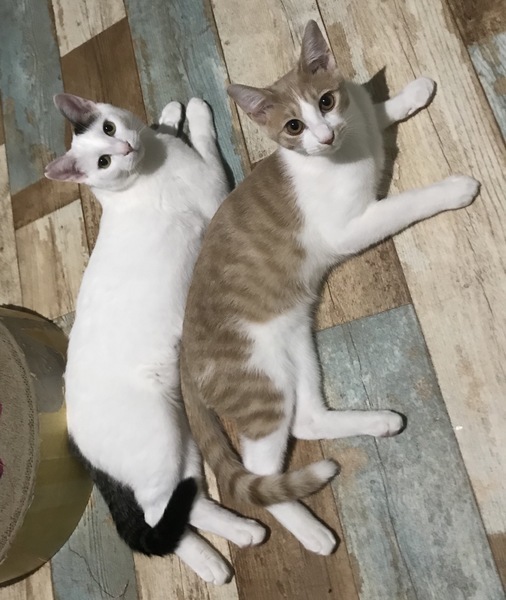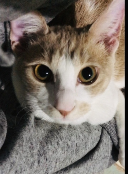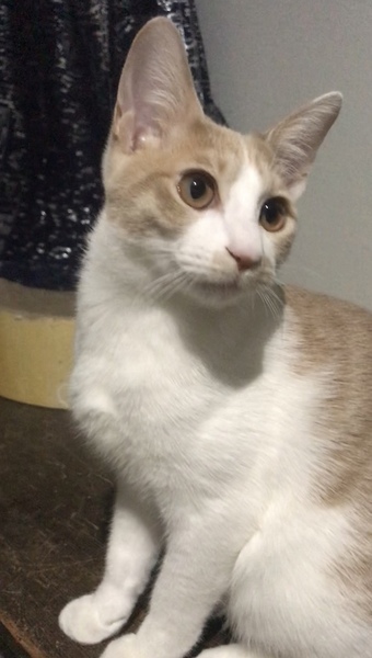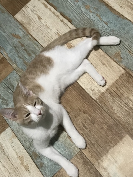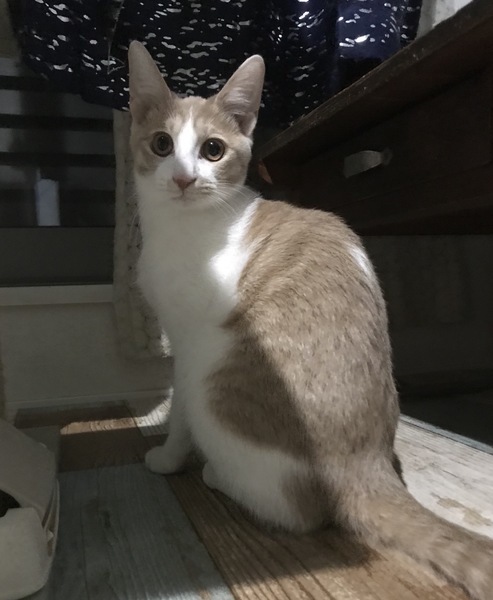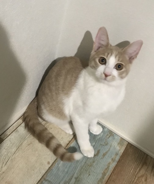 | 特徴(性格など) | 【仮名】チャイティーラテ君 ○元気いっぱいの7ヶ月半の男の子 ○ミルクティー色の茶とら柄。 ○キャンドルテイルの長いしっぽ。 ○ビビリですが、とても甘えん坊でお膝に乗ったり、一緒にお布団で寝てくれます。抱っこもできます。 ○走ってジャンプして、元気に遊んでいます。おもちゃが大好きです。 |