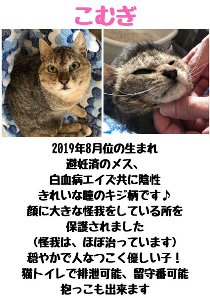 | 特徴(性格など) | かわいいキジ柄 白血病陰性・猫エイズ陰性 健康状態良好。 トイレ排泄可能 留守番OK 優しくて人懐こい性格です。猫飼い初心者の方にもおすすめ! 最初は少し怖がると思いますが、数日ですごく馴れます。 こむぎちゃんの詳細はこちら https://ameblo.jp/coconyanikkanoenmusubi/entry-12580460391.html |