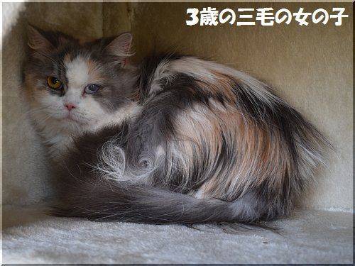 | 特徴(性格など) | スコティッシュフォールド(ロング) 色:キャリコ 名前は、ポピーちゃん 避妊手術 済み ワクチン 2回接種済み レボリューション 済み 環境が悪かったので、小さいときに風邪を引き、左目が少し濁っていますが、視力は問題ありません。 保護して間がないので、少し怖がりますが、暫くはケージで様子を見ていただきましたら、次第に慣れてきます。 |
