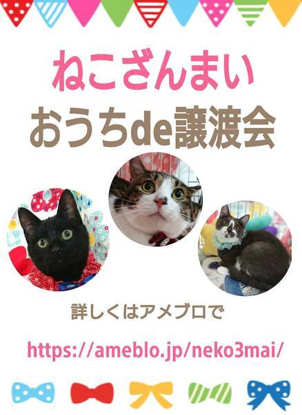 | その他(譲渡条件など) | ★★★お問い合わせ前に必ずご確認下さい★★★ 《里親様へお願いはこちら》 http://www.neko3mai.com/condition/condition.html ★里親希望のみなさまへ★ ペットではなく、家族の一員としてたっぷり愛情を注いでくださるご家庭を希望しております。 恐れ入りますが、 ・学生の方 ・一人暮らし、同棲中の方 ・子猫、若猫希望の60歳以上のみのご家庭 ・脱走防止対策にご協力いただけない方への譲渡は、 原則遠慮させていただいております。 〖共通条件〗 1.終生飼育 2.完全室内飼い 3.脱走防止対策へのご協力 4.避妊去勢手術 5.契約書類へのサイン 6.定期報告 7.医療費等の負担 当日の猫ちゃんを連れて帰ることはできません。後日、保護主が里親様のご自宅までお届け致します。 その為、移動の際の猫ちゃんの負担を月齢などから考慮し、お届け地区を限定させて頂くこともございますのでご了承ください。 |