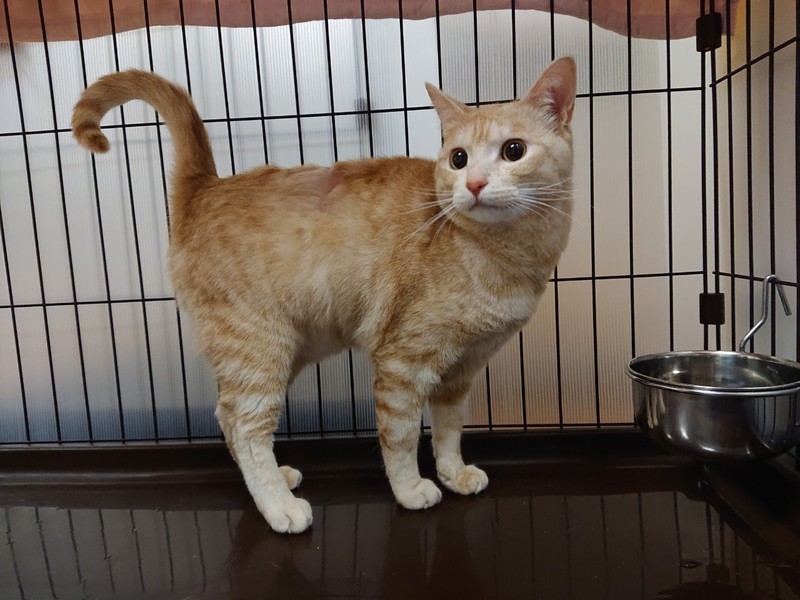 | 特徴(性格など) | 2018.1.21生まれ(推定) 毛色:茶トラ とても人懐こいエイタ。 真ん丸おめめがとってもかわいい男の子です。 頭スリスリ、ゴロゴロの甘えん坊さん。 背中の治療が続きましたが、それでも人間を好きでいてくれる優しい子です。 大人猫とも子猫とも仲良くなれるタイプです。 |