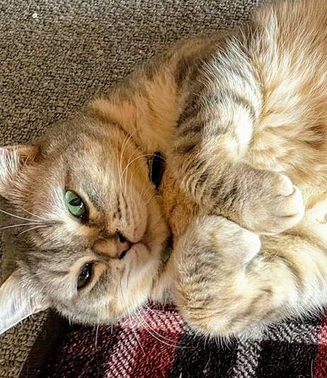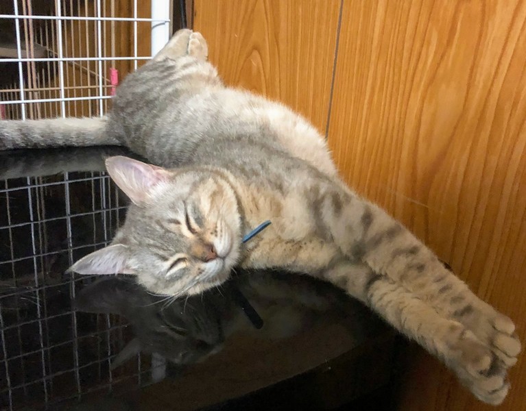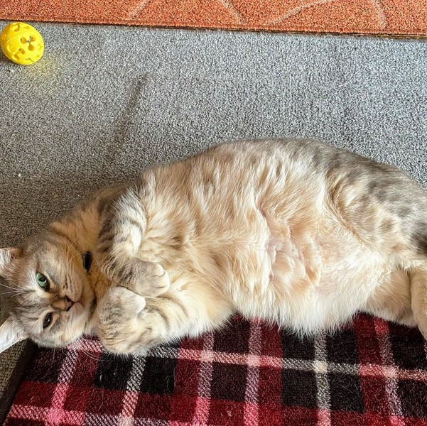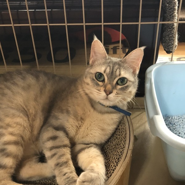 | 特徴(性格など) | おっとりマイペース、瞳が印象的な美猫のサバトラさんです。 すぐにころ~んと転がってお腹を見せてくれます。 あんよが短めなので高い所から降りるのは少し下手です。 持病などもなく元気ですが合わないフードを食べると吐き出してしまいます。 今は吐き出さないフードが見つかって安定しています(そして食に目覚めて今の体型に…)(預かりさんがダイエット頑張っています) |