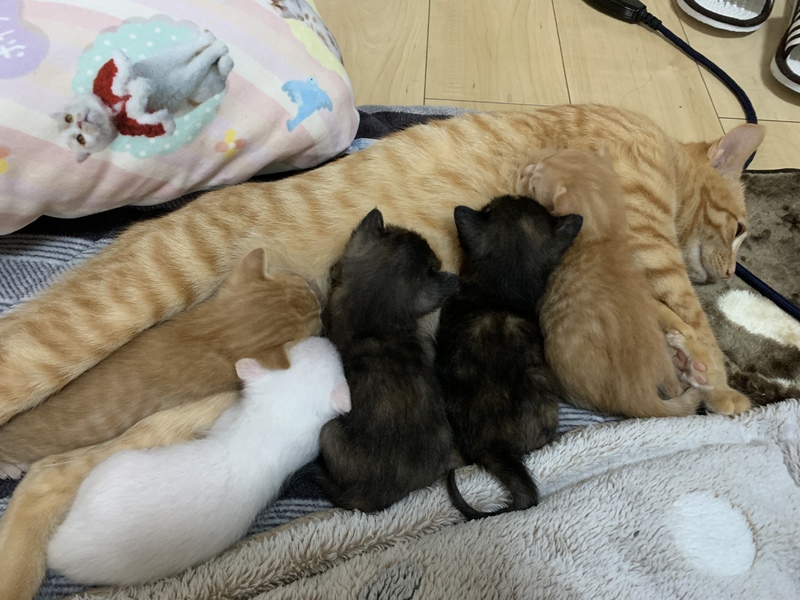 | 特徴(性格など) | 性別はまだ生まれたばかりなので判断出来ません。柄は、白1、茶トラ2、さび柄2匹です。 | ||