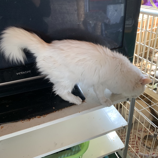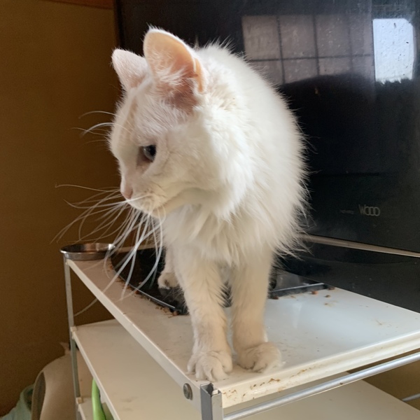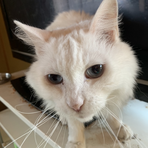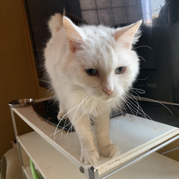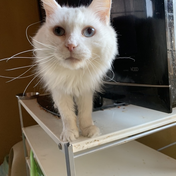 | 特徴(性格など) | 白色のフサフサな毛並みと青色の瞳がとても綺麗なみーちゃん。大人しく温厚な性格です。 | ||