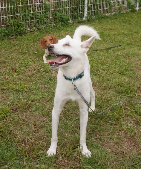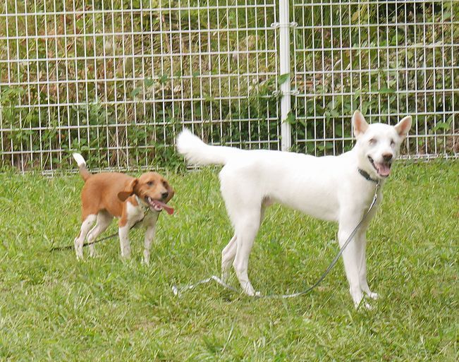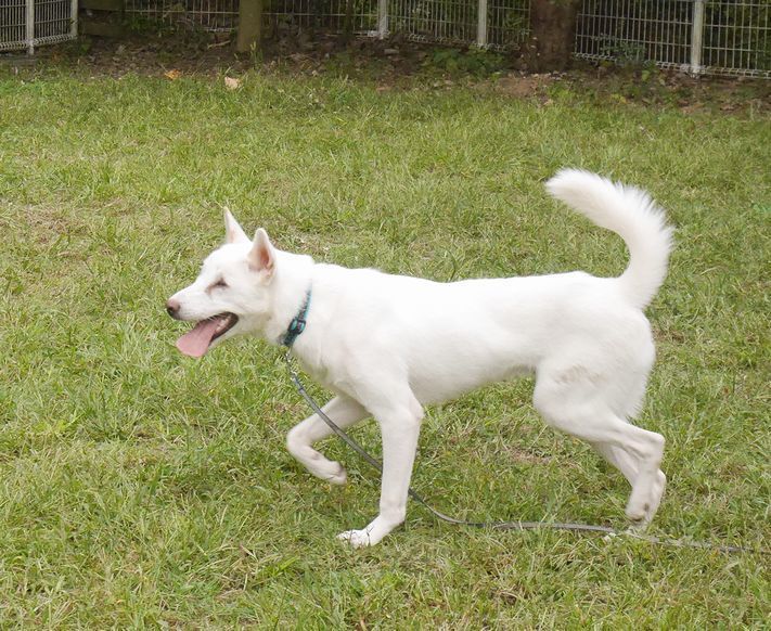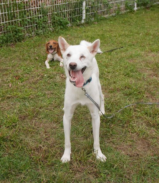 | 特徴(性格など) | 仮名は「翔真」 耳に少し茶色の毛が混じりますが、ほぼ真っ白の男の子です。 生まれつきの全盲だと思われ、左目は眼球がなく右目は小さな眼球が奥にありますが、視力はありません。 目が見えない状態で野犬としてよくここまで生きて来られたものだと思います。 目は見えなくても聴覚と臭覚と触覚で元気いっぱいにドッグランでも走っています。 目が見えないというハンデを少しでも克服できるよう、ドッグトレーナーさんとともに基本的しつけをしました。 ご飯の時、眼が見えないために取られないようにと警戒することがあります。 |
