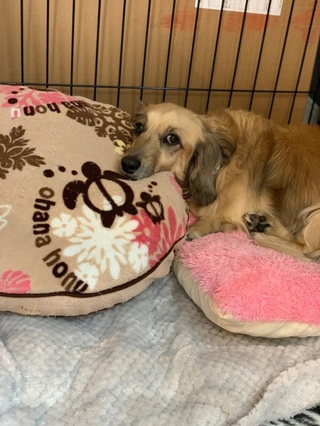 | 特徴(性格など) | 性格・特徴 ちゃあくん 【性格】 こわがりさんです。今まで他犬との接触がなかったため、相性により上手く付き合うことが難しい子もいます。猫にも吠えることがあります。 人は大好きで、なでてほしくて静かに近づいてくるタイプです。 少し撫でると、もっとかまって欲しくてアピールするので落ち着けるように練習をお願いします。 来客があると吠えますが、すぐに吠えやみます。 【トイレ】 シートの認識はありますが、まだトレーニング中です。 洗面所や玄関で隠れてすることがありますので、トイレで上手にできたらたくさんほめて、自信をつけながら練習をお願いします。 【お留守番】 サークルで寝てくれていますが、 たまに寂しくて小さくヒュンヒュン鳴きます。 放っておくとあきらめます。 帰宅時に吠えてしまうことがあるので、吠えないようトレーニング中です。 【お散歩】 大好きでたくさん歩いてくれます。たまに踏ん張るように立ち止まってしまうので、抱き上げて下ろすとまた歩き出します。 お散歩ではまだ排泄しません。 迷子札は、首輪に刻印式のIDカラーで装着して頂く事と、ダブルリード使用のお約束をお願いします。 【ごはん】 フード50gを1日2回食べています。 フードだけで食べない時はゆでささみなど混ぜると食べます。いつも少しだけ残します。 健康状態 ちゃあ君 犬種 ミニチュアダックスフンド 年齢 6歳くらい(2014年生まれ) 性別 男の子 体温 38.8℃ 体重 5.6Kg 口腔 スケーリング済み 皮膚 異常なし 眼 右目瞳孔散大 耳 異常なし 鼻 異常なし 膝蓋骨脱臼 両足G1 鼠径ヘルニア 異常なし 臍ヘルニア 異常なし 心雑音 異常なし 検便 異常なし 血液検査 異常なし レントゲン 腰椎第2〜3間変形性脊椎症 去勢 済み 心電図 異常なし フィラリア 陰性 レボリューション 済み ワクチン 済み 狂犬病予防接種 済み |