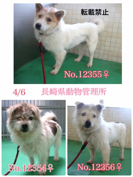 | 特徴(性格など) | テリア系mixの小柄な中型雑種、男の子3匹・女の子6匹の計9匹が飼主死亡により、親族の手で、処分依頼で保健所へ持ち込まれ、長崎県動物管理所に収容されました。 (写真の首輪は管理所でつけた物です。生まれて初めての首輪に最初はビックリして固まっていました(^◇^;) ) 犬はどんな飼い主でも信じています。 信じてきた飼い主が居なくなった上に収容された今どんなに不安で寂しい思いでしょうか( ; ; ) 狭い敷地内で首輪もせずにお散歩もせずに放し飼いにされていて人の愛情、温かさをあまり知らずに育ってきたようです(>_<) 暑さ、寒さ、雨風にも耐えるしか無いまま生きてきました。でも優しい子達です( ; ; )そんな悲しい状況のままでいたより、良かったと考え、この子達皆の幸せを、温かい本当の本物の家族を見つけたいと願っております⭐︎⭐︎ こちらはその9匹のうち女の子3匹、 管理番号 No.12354 No.12355 No.12366 黒白茶色のテリア系mixちゃんです(^^) 毛並みが悪く酷く汚れて毛玉があります。 見た目の推定になりますがどの子も小柄な中型で現在の体重は大体8〜10キロ前後位、年齢は5歳〜8歳位でしょうか。マンションでも飼育しやすいサイズです。 可哀想に突然収容され、何もかもが初めての知らない場所、環境になるので無理もありませんが、収容当初はとても怖がっていて尻尾は垂れ、巻き込んでいました( ; ; ) でも人懐こく尻尾を振って寄ってきてくれますし、攻撃性は無く、おっかなびっくりで逃げようとはするものの身体中何処でも触らせてくれて手からおやつも食べる様になりました⁺◟( ᵒ̴̶̷̥́ ·̫ ᵒ̴̶̷̣̥̀ )馴れは早そうに思えますがマテやお座りなどの躾は全くされていませんでした(>_<)あと今のところ他の子達が吠えたらつられて吠えています。 優しい職員さん方が怖くないよ、今度こそは幸せになれます様にと毎日触れ合いながら、一生懸命にお世話してくださっています。 リードも初体験なので付けたら怖がって暴れて嫌がったのでこれから徐々にお散歩の楽しさを知ってもらえる様に練習も開始していきます。 リードの引きの強さなどはまだ分かりませんがお散歩経験の無い子達です。 怖がって、最初は逃げよう逃げようとする子もいますので、脱走、逃走には充分に注意が必要ですm(_ _)m 適切に制御し、躾や散歩などの運動の時間をしっかり取ることの出来る、沢山優しく触れ合って頂けるご家庭を希望しておりますm(_ _)m 人間が焦らずにゆっくり長い目で見守りながら、愛情を持って接すれば、この子達ならきっとじきに新しい家庭に馴染んでいけるのでは、と思います。 辛い過去がある事、傷付いているであろう心も踏まえ、人は怖くないんだよと、人を信じてくれる様に、広い心で例え長期戦でもドンとこい^_^と仰って頂ける方、まだちょっと怯えていて不安気な困り顔のこの子達を、いつか尻尾フリフリ♪ニコニコの笑顔にしてくださる方、いらっしゃいませんか? どうぞ宜しくお願い申し上げますm(_ _)m ⭐️必ず室内飼育で、譲渡後には速やかな病院受診・健康診断・避妊手術、混合ワクチンをする事が可能な、なるべくお留守番が少ない、沢山優しく触れ合っていただけるご家庭。(避妊手術の際に歯石除去も必要ですm(_ _)m ) ⭐️トイレトレーニングも1からとなります m(_ _)m 何かと手がかかり大変ですが覚悟と根気、理解で受け入れて下さる方。 ※ お早めの避妊手術、その際には歯石除去もお願いしますm(_ _)m ⭐️犬の飼育経験があり愛情を持って犬をしっかり躾することが出来る方、お散歩や運動に充分時間をあてられる方、場合によりトレーニング教室なども視野に入れて考えてくださる方。 何卒宜しくお願い致します。 ⭐️狂犬病予防接種、フィラリア予防や混合ワクチン実績、避妊手術は無いまま持ち込まれました(>_<) ♂♀放し飼いだった為、妊娠やフィラリア陽性の可能性も0では無く有り得る事となります。 以上の点を踏まえ、この子達の置かれている状況、辛かった過去、傷付いた心をご理解の上、全て受け入れ、寄り添いながら愛情を注いでくださるご家庭で可愛がっていただきたいと願っております。 収容された全ての子は身勝手な人間による被害者であり、何も悪くありません( ; ; ) 家族の一員として生涯大切にしてくださる優しいご家庭とのご縁が結ばれ、今度こそは幸せになれます様に!♡ 1日も早く温かな愛情を目一杯注がれながら、元気に幸せに生きてほしいです。人間より遙かに短い生涯です。 冷え込む硬いコンクリートの上、檻の中で、命の期限が迫る中、ひたすら優しい素敵な里親様を待ち続けています。 悲しい事にこの世の中、人間に飼われないと犬は生きていく事が出来ません。 捨てる飼い主、探さない飼い主、医療にかけない飼い主、虐待する飼い主…飼い主を選ぶ事も出来ません。 まだこれからのこの子達を、生涯大切に可愛がって下さる優しい素敵な里親様、どうかお願い致します。きっと、必ず最高の家族にな