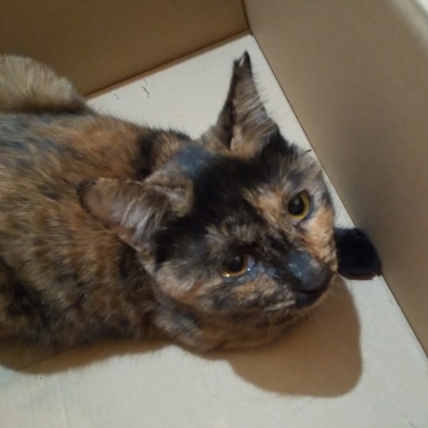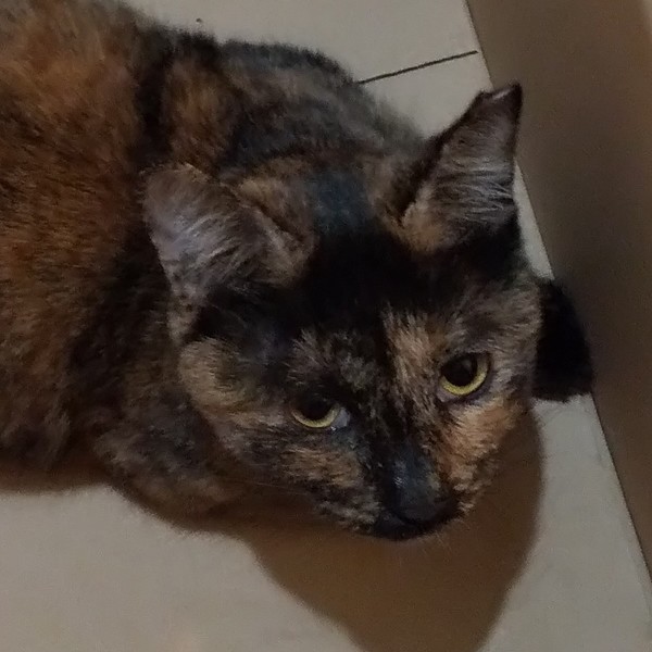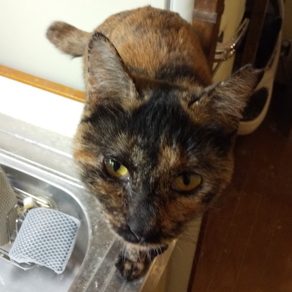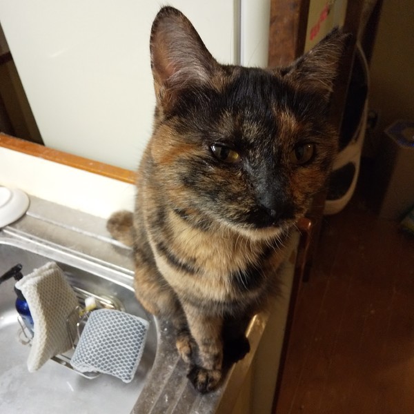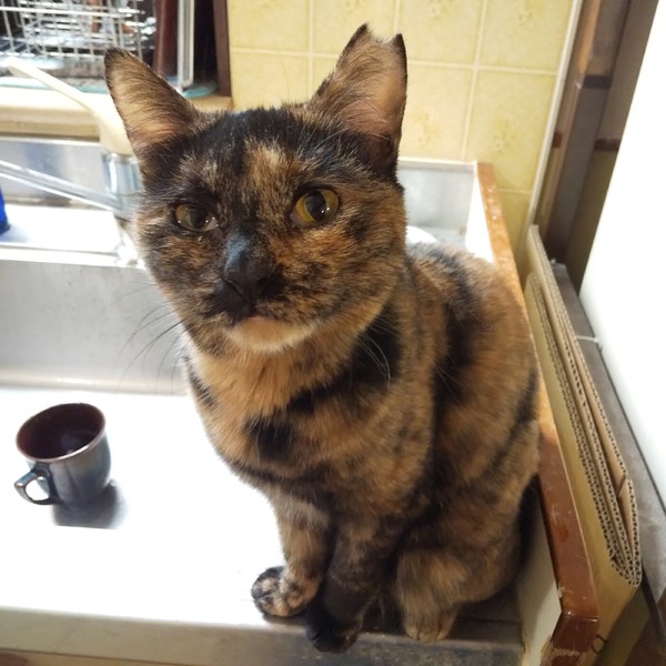 | 特徴(性格など) | 仮名:まどか 毛色:サビ柄で黒い毛が格子状にも見えます。 瞳の色:明るい茶 尻尾:中ぐらいの長さの曲がり尻尾 性格・特徴:生後9か月の男の子と同じくらいの小柄な体型です。 人見知りはまったくなく、ほかの子のお見合いに来た方にもすぐにゴロゴロスリスリして愛嬌をふりまいています。 自分からおヒザ抱っこもしてきます。 右目が常に涙目ですが、それにも増してかわいさ満点の子です。 これまで劣悪な環境で辛い思いをしてきた分、愛情たっぷりに育ててくれる方を希望します。 システムトイレのしつけ済み。 左耳に桜カットあり。 人は大好きですが、知らない猫に対しては遠慮がちなので、同じ多頭崩壊宅から来た子とペアでの譲渡を希望します。 |