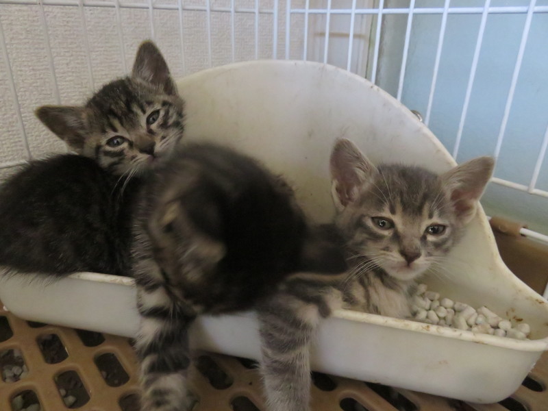 | 特徴(性格など) | キジトラ5匹、黒1匹。4/19時点で性別未確認。健康状態は特に問題無し。保護したときはさすがに怖かったようでシャーが少しありましたが、まだ小さいこともあり、保護後はすぐに慣れ、特に警戒心もなく兄弟全員仲良く子猫らしく活発に家中動き回っています。まだあまり構っていないので人馴れはこれからの接し方次第でどんどん慣れると思われます。 | ||