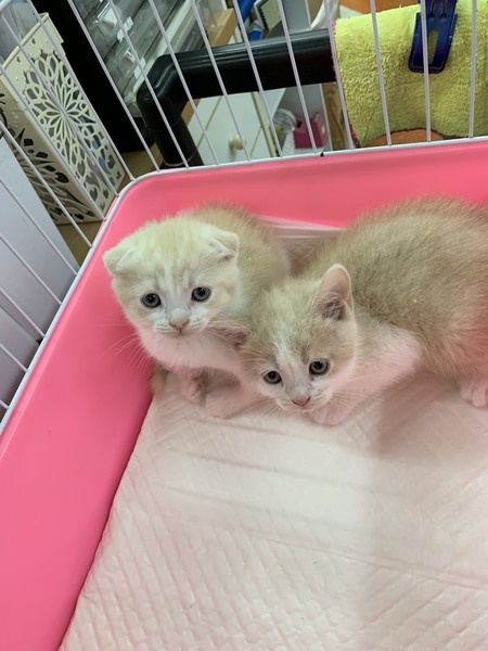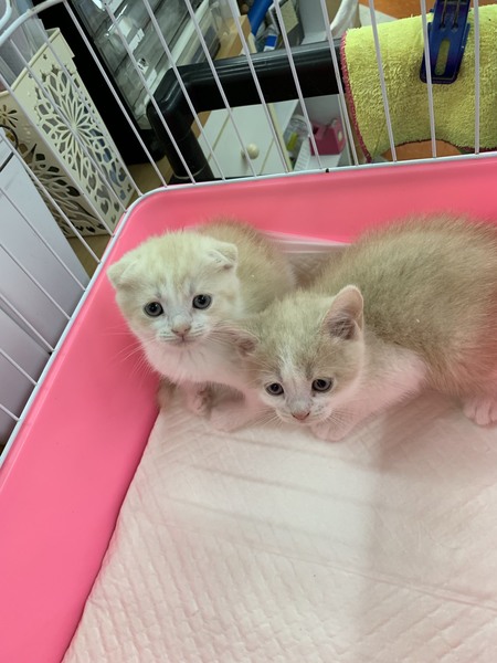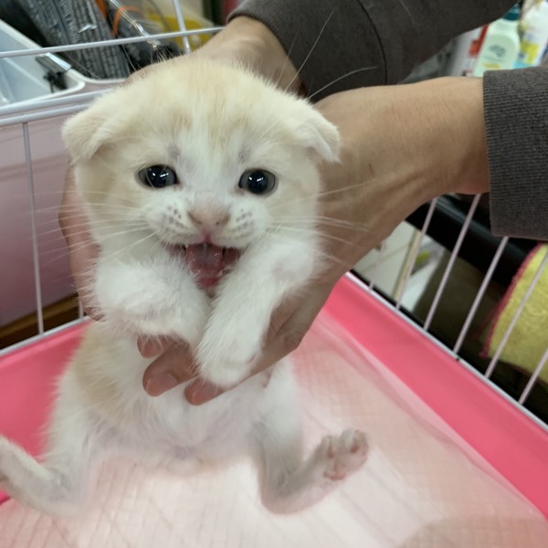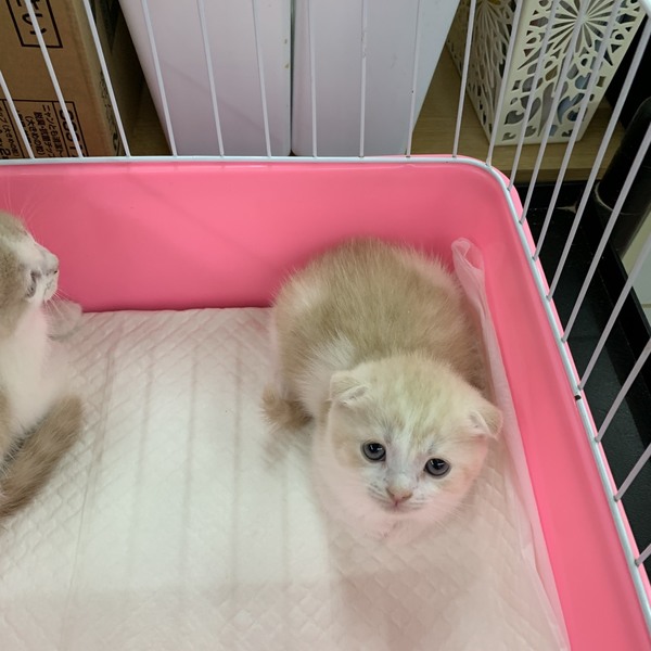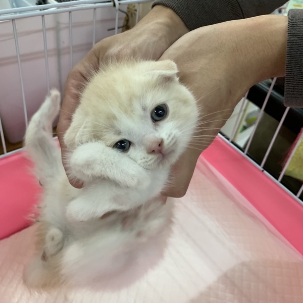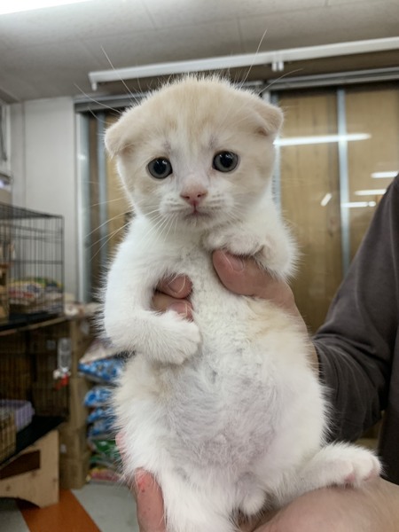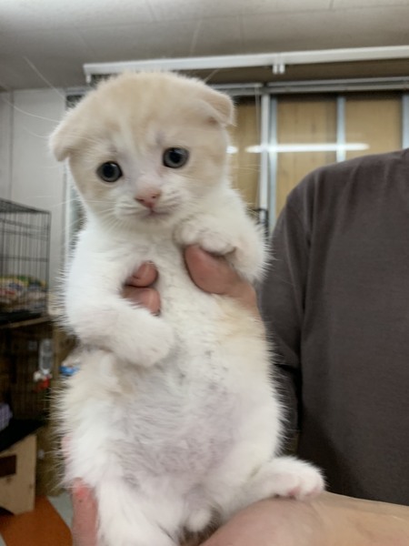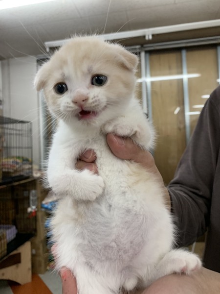 | 特徴(性格など) | スコティッシュ折れ耳の男の子です。 色はクリームタビーアンドホワイト。 生後2ヶ月でとてもかわいいです。 生まれつき両前足の関節に異常があります。歩行がやや困難に見えますが 、元気に遊び回っています。健康状態は良好です。 単身者さま・シニア世代の方は要相談になります。 愛情をもって家族の一員として迎えてあげて下さい。よろしくお願いします。 |