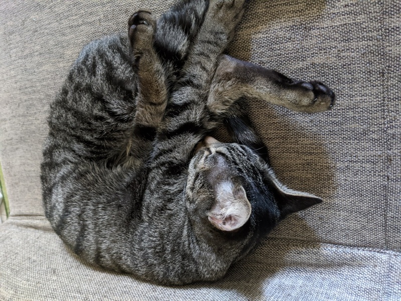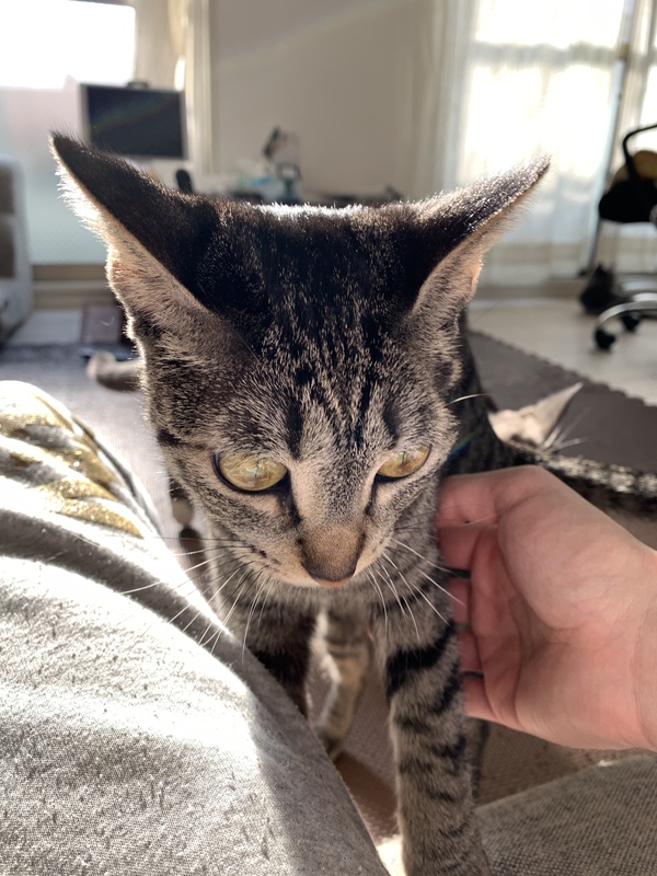 | 特徴(性格など) | キジトラ?サビトラ?? 黒がメインの縞様です。 臆病です。というより人見知りします。 体格はかなり小柄です。 遊ぶのも撫でられるのもどちらも好きです。 |
