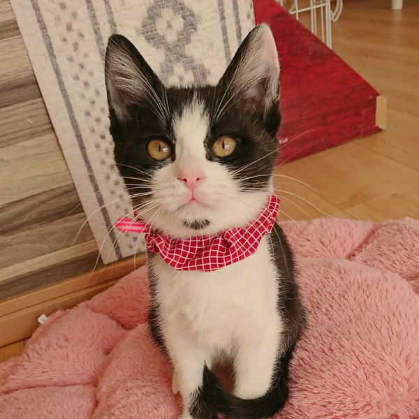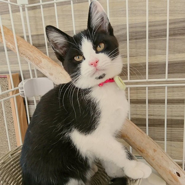| 特徴(性格など) | 黒白はちわれ あごのホクロがチャームポイント♪ とっても人懐こく、遊ぶのが大好きです。さみしがり屋さんの一面もあるので在宅時間が長いかたが希望です。 |