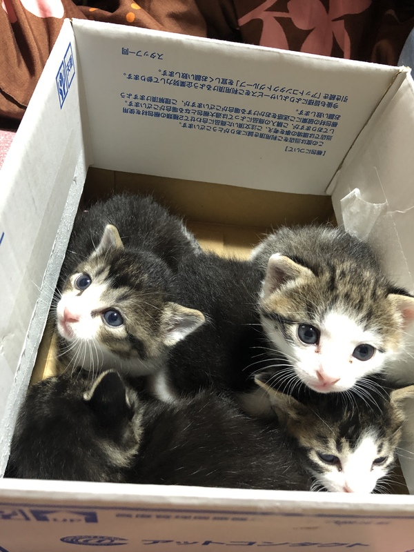 | 里親募集する理由 | 我が家の周りに住む野良猫ちゃんが我が家のガレージで赤ちゃんを産みました。母ネコを捕獲し、避妊手術ができたら良いのですが警戒心が強く捕まりません。その母ネコが一生懸命仔猫を育てていますが、成長したら大変な事になってしまいます。 可愛いので里親を探してあげたく、1匹は近所の方が可愛いからと里親になってくれました。残り3匹はオス猫ちゃんです。残り1匹なら我が家で飼うつもりですが、宜しくお願いします。 神奈川県、東京都内なら電車で最寄りの駅まで届ける事は可能です。 |