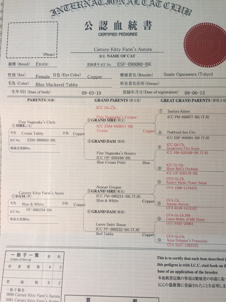 | 特徴(性格など) | エキゾチックショートヘアー 女の子 グレー色の毛並みです。 血統書は写真で添付しております。 性格は極めて温厚で大人しく、人懐っこくよく甘える子です。 マンションで飼育しておりますが、おしゃべり時に小さくニャっと泣く程度で、大きな声で泣く事が全く無い為 他の住民に気づかれた事がありません。 小さい頃から暴れたり家具等傷つける事も無く、全く手がかからない子でした。 エキゾチックの特徴である目鼻立ちが可愛らしく、11歳ですが いつまでも若い猫のようなお顔です。 これまでフードはロイヤルカナン(ウェットは時々)しか与えてきておらず、糞尿の臭いも抑えられており、尿結石もありません。 |