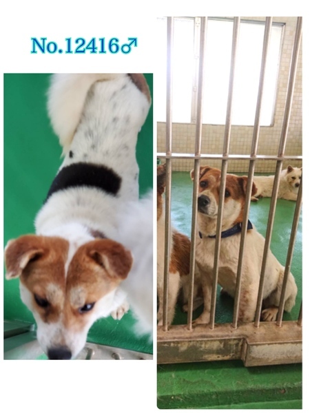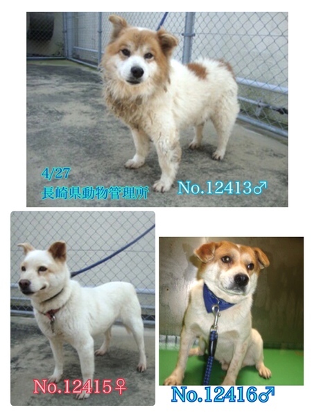 | 特徴(性格など) | 中型雑種男の子女の子計18匹が飼主死亡により、親族の手で、処分依頼で保健所へ持ち込まれ、長崎県動物管理所に収容されました。 (写真の首輪は管理所でつけた物です。中には古びて汚れ切った首輪をしていた子もいますが生まれて初めての首輪に最初はビックリして固まっていました(^◇^;) ) 犬はどんな飼い主でも信じています。 信じてきた飼い主が居なくなった上に収容された今どんなに不安で寂しい思いでしょうか( ; ; ) 狭い敷地内で首輪もせずにお散歩もせずに放し飼いにされていて人の愛情、温かさをあまり知らずに育ってきたようです(>_<) 木に短く繋がれたままだった子もいました。暑さ、寒さ、雨風にも耐えるしか無いまま生きてきました。それでも人が大好きな優しい子達です( ; ; )そんな悲しい状況のままでいたより、良かったと考え、この子達皆の幸せを、温かい本当の本物の家族を見つけたいと願っております⭐︎⭐︎ こちらはそのうちの、木に短く繋がれていた男の子2匹、女の子1匹です。 管理番号 No.12416 茶白 男の子(3匹の中で小さめ推定10キロ前後位) No.12415白茶 女の子(推定12〜14キロ前後位) No.12413 茶白 男の子(推定12〜14キロ前後位) 毛並みが悪く、酷く汚れて毛玉があったりします( ; ; )綺麗にブラッシング、シャンプーカットをして栄養をつけたらもっと可愛く見違えると思います♡ 持ち込んだ親族は年齢を把握しておらず不明の為、見た目の推定になりますがどの子も年齢は5〜8歳位でしょうか。 可哀想に突然収容され、何もかもが初めての知らない場所、環境になるので無理もありませんが、収容当初は怖がっていていました。 今はとても人懐こく尻尾を振って寄ってきてくれますし身体中何処でも触らせてくれて手からおやつも食べる様になりました⁺◟( ᵒ̴̶̷̥́ ·̫ ᵒ̴̶̷̣̥̀ )抱っこも出来ます(^^)どの子も人が大好きですがマテやお座りなどの躾は全くされていませんでした(>_<)他の子達が吠えたらつられて吠えてはいますが無駄吠えはありません。 優しい職員さん方が怖くないよ、今度こそは幸せになれます様にと毎日触れ合いながら、一生懸命にお世話してくださっています。 リードも初体験なのでこれから徐々にお散歩の楽しさを知ってもらえる様に練習も開始しており、12415♀12413♂は問題無く歩けていて、お座りもしますฅ•ﻌ•ฅ 12413♂はまだリードに戸惑って這いつくばってしまうので引きの強さなどはまだ分かりませんがどの子もちゃんとしたお散歩経験の無い子達です。 怖がって、最初は逃げよう逃げようとする子もいますので、どんな子でも脱走、逃走には充分に注意が必要ですm(_ _)m 適切に制御し、躾や散歩などの運動の時間をしっかり取ることの出来る、沢山優しく触れ合って頂けるご家庭を希望しております m(_ _)m 人間が焦らずにゆっくり長い目で見守りながら、愛情を持って接すれば、この子達ならきっとじきに新しい家庭に馴染んでいけるのでは、と思います。 辛い過去がある事、傷付いているであろう心も踏まえ、人は怖くないんだよと、人を信じてくれる様に、広い心で例え長期戦でもドンとこい^_^と仰って頂ける方、愛に飢えているこの子達を、尻尾フリフリ♪ニコニコの笑顔にしてくださる方、いらっしゃいませんか? どうぞ宜しくお願い申し上げますm(_ _)m ⭐️必ず室内飼育で、譲渡後には速やかな病院受診・健康診断・去勢手術、混合ワクチンをする事が可能な、なるべくお留守番が少ない、沢山優しく触れ合っていただけるご家庭。 ⭐️トイレトレーニングも1からとなります m(_ _)m 何かと手がかかり大変ですが(マナーベルトやL字型のトイレ、ペットシートを用意など)覚悟と根気・理解で受け入れて下さる方。 ※ お早めの避妊・去勢手術、その際には歯石除去もお願いしますm(_ _)m ⭐️犬の飼育経験があり愛情を持って犬をしっかり躾することが出来る方、スキンシップやコミュニケーション、お散歩や運動に充分時間をあてられる方、場合によりトレーニング教室なども視野に入れて考えてくださる方。 何卒宜しくお願い致します。 ⭐️狂犬病予防接種、フィラリア予防や混合ワクチン実績は何も無いまま持ち込まれました(>_<) 外に繋がれていたのでフィラリア陽性の可能性も0では無く有り得る事となります。 以上の点を踏まえ、この子達の置かれている状況、辛かった過去、傷付いた心をご理解の上、全て受け入れ、寄り添いながら愛情を注いでくださるご家庭で可愛がっていただきたいと願っております。 収容された全ての子は身勝手な人間による被害者であり、何も悪くありません( ; ; ) 家族の一員として生涯大切にしてくださる優しいご家庭とのご縁が結ばれ、今度こそは幸せになれます様に!♡ 1日も早く温かな愛情を目一杯注がれながら、元気に幸せに生きてほしいです。人間より遙かに短い生涯です。 冷たく硬いコンクリートの上、檻の中で、命の期限が迫る中、ひたすら優しい素敵な里親様を待ち続けていま