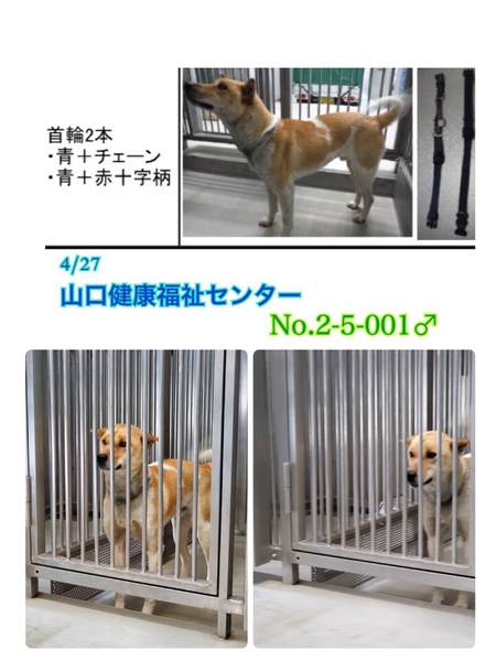 | 特徴(性格など) | 茶白でやや大きめの中型雑種、3〜8歳位に見受けられる可愛い男の子がひとりぼっち寂しく助けを待っています! 山口県山口市阿東にて保護され4/27(月)に山口健康福祉センターに収容されました。 人懐こく甘えん坊タイプ(^^)見た目の推定になりますが体重は17〜20キロ前後位でしょうか。ずっと狭い檻の中、とても寂しそう…お散歩もしてもらえない為ストレスも溜まっている筈なのに無駄吠えする事も無くお利口さんにひたすら待っています( ; ; ) 捨てられたのでしょうか、迷子でしょうか。何故ここに居なければならないのでしょう。 人間よりはるかに短い犬生なのに。 何故大切な家族を直ぐに探さないのか、 何故最後迄愛せないのでしょうか… 保護時、首輪2本(青+チェーン ・青+赤十字柄)をしていましたが鑑札や迷子札などは何もついていませんでした。可哀想にいつから彷徨っていたのか…ひとりぼっちで寒さや空腹、雨風にも苦しんできたことでしょう。。 家族の元へ帰りたい、でも収容されたら帰れません。 言葉を持たない大事な家族を守る為に首輪、胴輪には迷子札、鑑札を必ずつけて頂きたい、そして、そんな環境のままでいたより保護されて良かったと考え、この子の幸せを、温かい本当の家族を見つけたいと願っております☆ 短いですがこの子の様子を撮影した動画もございますので是非ご覧いただきたく思います、お声掛けをお待ちしております♡ 他にも山口県の各センターに沢山の子達が日々次々に収容され、里親様とのご縁を待っています。 山口県の期限は基本約一週間、里親様がみつからないと愛護センターに移送、一部譲渡可能な子(子犬や子猫が殆ど)は殺処分を免れますが、それ以外はもがき苦しむガス窒息殺処分になってしまいます。 又、可哀想に収容中はお散歩も無くずっと狭い檻の中です。どんなにここから出たいでしょうか( ; ; )でも家族の一員として迎え入れてくださる方が現れない限り、もう檻の中から出られる事は無く、殺処分機のある動物愛護センターへ移送となります。 どうか温かい家族に出会えますように。。 良いご縁を頂けます様に! どうぞ宜しくお願い致します!! お散歩が無いのでリードの引きの強さは分かりませんが、どんな子でも油断禁物で脱走・逃走には充分に注意が必要ですm(_ _)m 適切に制御し、躾や散歩などの運動の時間をしっかり取ることの出来るご家庭を希望しております。 人間が焦らずゆっくり長い目で見守りながら、根気よく愛情を持って接すれば、この子ならきっと!じきに新しい家庭に馴染んでいけるのでは、と思います♡ 広い心でドンとこい^_^と仰って頂ける方、この子をニコニコの幸せ笑顔にしてくださる方、いらっしゃいませんか?どうぞ宜しくお願い申し上げますm(_ _)m ⭐️必ず室内飼育で、譲渡後速やかに病院受診、健康診断、お早めに去勢手術、混合ワクチン接種をする事が可能な、なるべくお留守番が少ない、沢山優しく触れ合っていただけるご家庭。 ⭐️室内でのトイレの躾も1からとなります。 当分の間は何かと手がかかり大変だと思いますが(マナーベルトやL字型のトイレ、ペットシートを用意など) 覚悟と根気・理解で受け入れて下さる方。 ⭐️犬の飼育経験があり愛情を持って犬をしっかり躾することが出来る方、お散歩や運動、スキンシップやコミュニケーションに充分時間をあてられる方、場合によりトレーニング教室なども視野に入れて考えてくださる方。 何卒宜しくお願い致します。 ※混合ワクチン、狂犬病予防接種、フィラリア予防実績の有無は不明です。フィラリア陽性の可能性も0では無くあり得ることとなります(>_<) 以上の点を踏まえ、この子の置かれている状況、寂しさ、傷付いているであろう心をご理解のうえ、全て受け入れ寄り添っていただけるご家庭で終生可愛がっていただきたいと祈っております。 保健所収容された全ての子達は身勝手な人間による被害者であり、何も悪くありません( ; ; ) 家族の一員として生涯大切にしてくださる優しいご家庭とのご縁が結ばれ、新しいこの春からは幸せになれます様に♡檻の中から出られて家族の皆さんとずっと一緒に居られるお家が見つかります様に。 1日も早く温かな愛情を目一杯注がれながら、元気に幸せに生きてほしいです。人間より遙かに短い生涯です。 冷たく硬いコンクリートの上、狭い檻の中で、命の期限が迫る中、ひたすら優しい素敵な里親様を待ち続けています。 悲しい事にこの世の中、人間に飼われないと犬は生きていく事が出来ません。 捨てる飼い主、探さない飼い主、医療にかけない飼い主、虐待する飼い主…飼い主を選ぶ事も出来ません。まだまだこれからのこの子を生涯大切に可愛がって下さる優しい素敵な里親様、どうかお願い致します。きっと、必ず最高の家族になります! もうこれ以上悲しく辛い目に遭わせたくありません。本当の愛情、温もりを知ってほしい、辛かった分、寂しかった分、まだまだこれ
