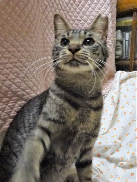 | 特徴(性格など) | 仮名: クララちゃん(メス) 毛色: キジトラ、尻尾長い 性格: 少しだけ怖がりの所があるので、最初は人見知りするかもしれませんが、すぐに抱っこ出来るような子です。 人は好きだと思います。 まだベタベタ甘えるわけではないですが、触ったり抱っこしたりしても嫌がりません。 保護部屋では気の合わない子もいるようですが、ちゃんと距離を取って、トラブルなく上手く付き合えるようです。 |