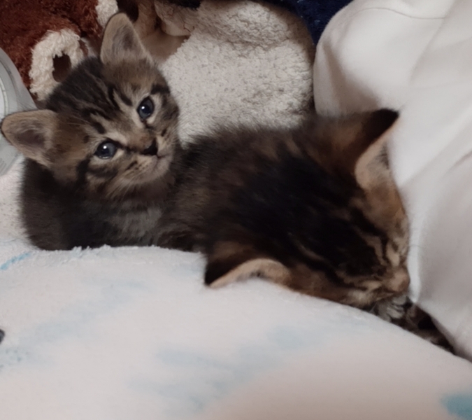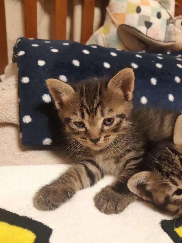 | 特徴(性格など) | キジトラ♂こげ茶系2020.4.12産 活発、人懐こい ただ今、離乳&トイレトレーニング中です(^^) ドライフードも食べるようになってきて、トイレも上手になってきました! 母親猫☆猫エイズ有、白血病無 補足☆掲載中の3匹は他でも募集しているため、決まり次第終了とさせて頂きますm(_ _)m |