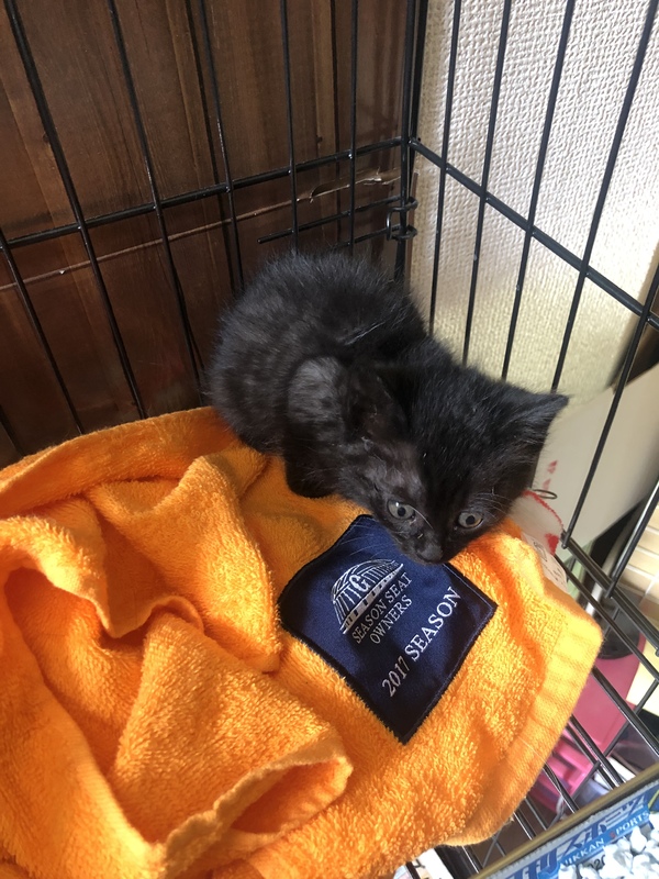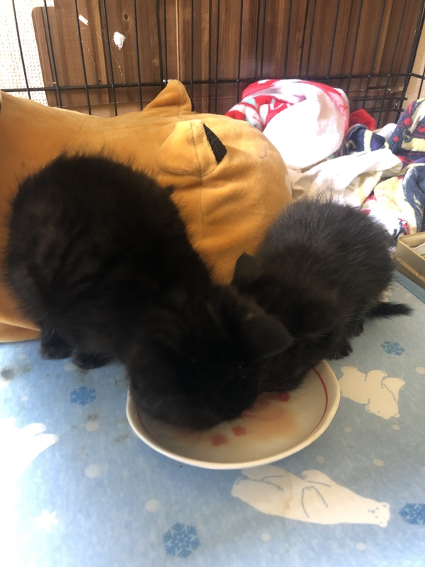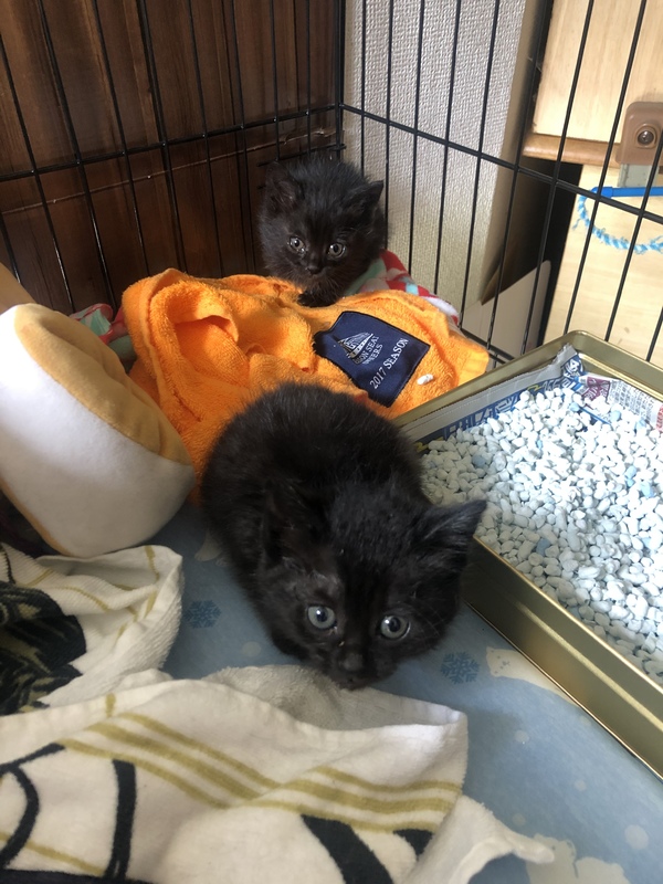 | 特徴(性格など) | 薄い縞の入った黒ネコのきょうだいです。 少し大きいコは大人しめの性格。 小さいコはやんちゃです。 元気で食欲も旺盛です。 既に離乳食でご飯も食べています。 |