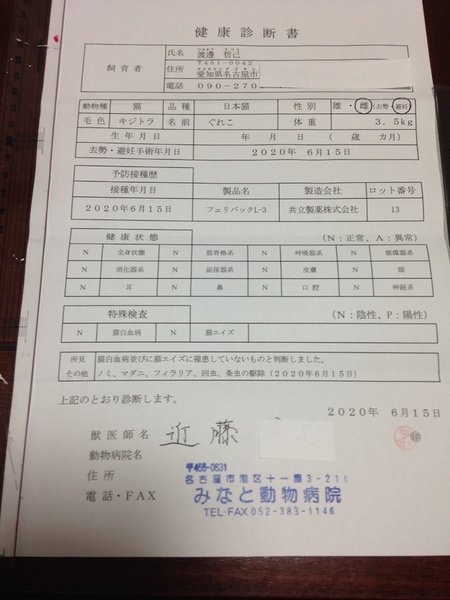 | ワクチン | 済 | 不妊去勢手術 | 済 |