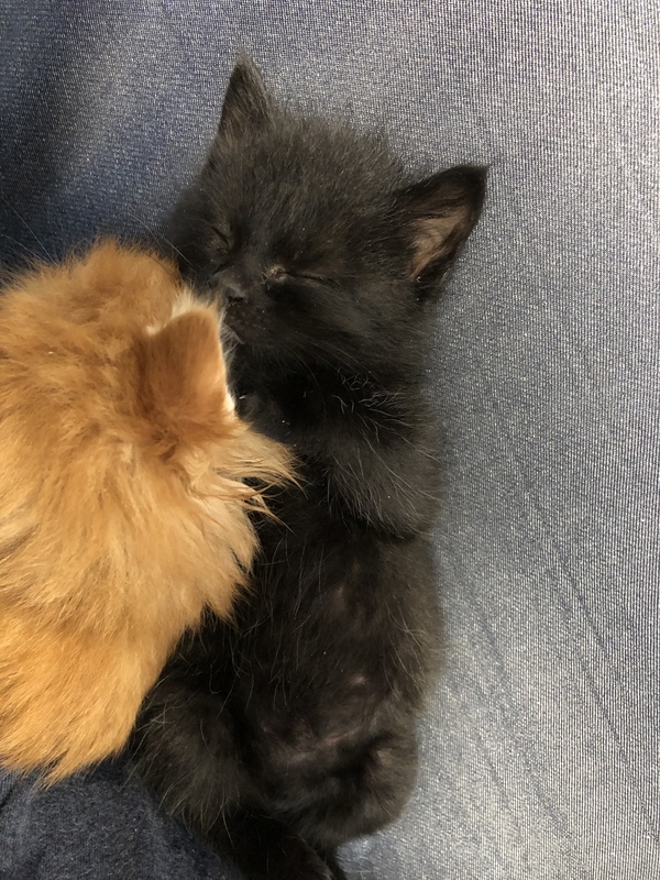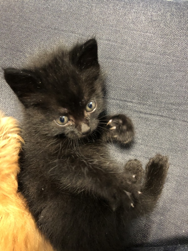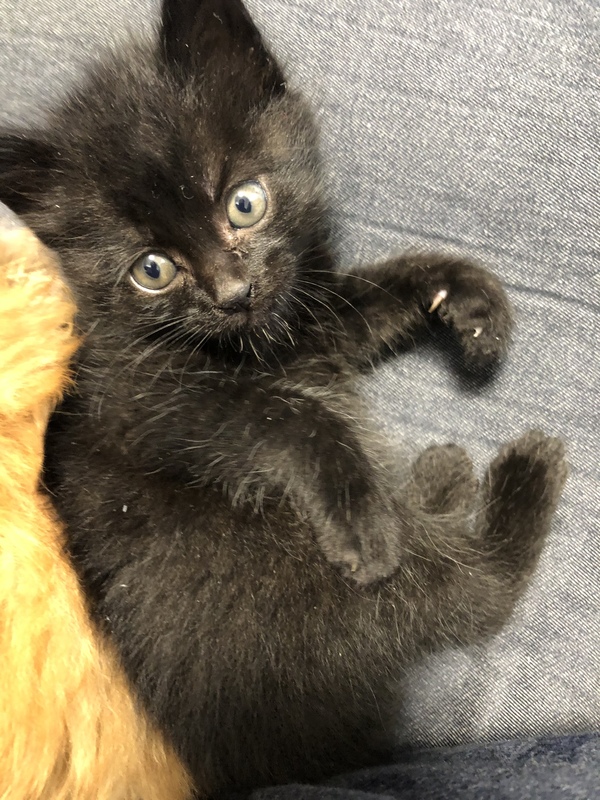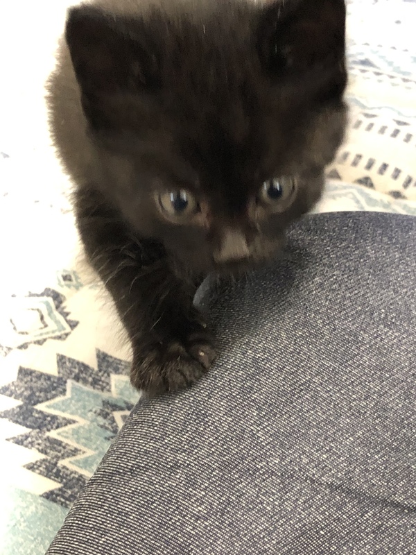 | 特徴(性格など) | 真っ黒で白い部分なしです。 目が黄色くなりつつある感じです。 性格は、人にだいぶ慣れて戯れてきたり、膝に乗ってきて甘えてそのまま寝たり。兄妹猫と格闘して遊んだり、とにかく元気です! |