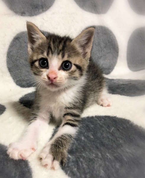 | 特徴(性格など) | 仮名、ポヤル 大きな瞳・細かいシマシマ・キジ白男の子 人懐こくて甘えん坊+食いしん坊 一緒に保護された皆と追いかけっこしていると思ったら、いつの間にか外れ見えない敵と戦っていたりします。 オモチャに向かって繰り出すパンチは「もちっ・・もち・・」っと、聞こえるような動き。 何となくのんびりしています。 |