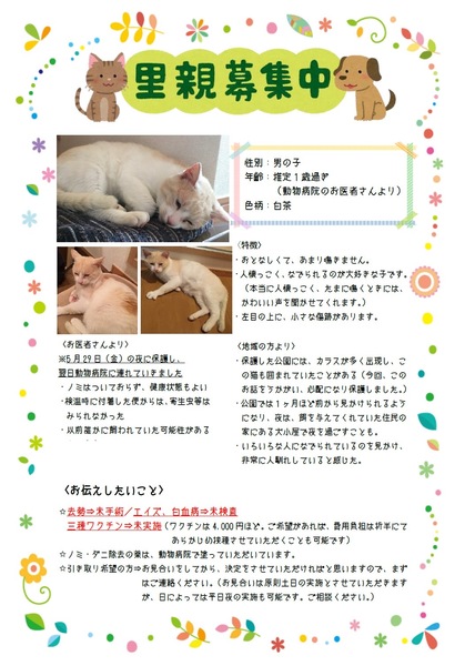 | 特徴(性格など) | 色柄:白茶 性格:おとなしく、あまり鳴きません。 とても人懐っこく、なでられるのが大好きです。 左目のななめ上に小さな傷痕があります。 お医者さんによると、前歯が一本かけているとのことです。 |