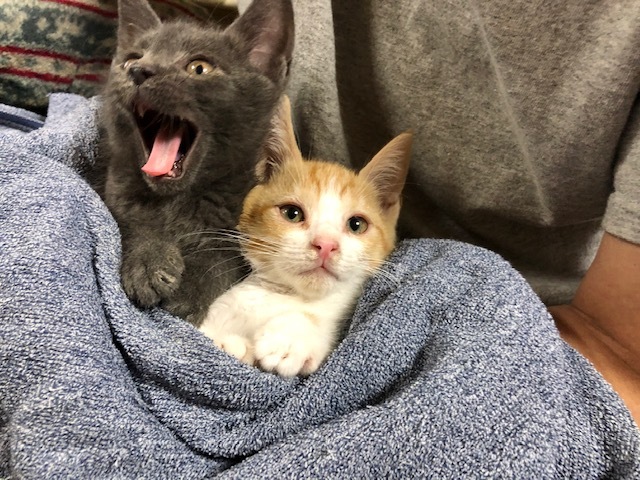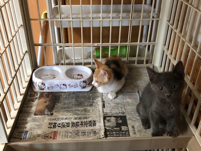 | 特徴(性格など) | ※色白美人な三毛猫さん 顔は茶トラ白ですが体はお洒落な三毛柄 2020年5月30日現在体重940グラム トイレしつけ済み 虫駆除薬添付済み 猫エイズ、白血病ともに陰性 ※薄め灰色わずかに縞模様ありの男の子。 2020年5月30日現在体重900グラム トイレしつけ済み 虫駆除薬添付済み 猫エイズ、白血病ともに陰性 実家の駐車スペースにて風邪の為目がふさがっている灰色の子猫をを5月下旬に母が保護しました。 現在は目は回復済みのため、目薬はほぼ必要なし。 鼻水はまだ出るので、飲み薬を飲ませています。 (さほど嫌がらず上手く飲んでくれます) とても人懐っこく、抱っこも嫌がりませんが、目が開く様になったら喜んで子猫らしく遊びまわるようになりました。猫じゃらし等おもちゃも好きです。 翌日一人で実家の前の植木鉢で寝ていた妹の三毛猫も保護し、とても仲良しです。 他には存命の兄弟はいないようです。 オスメスのペアになるので避妊・去勢のタイミングに注意が必要ではありますが、仲の良い兄妹なので、一緒に迎えてくださる方は大歓迎です。 食欲も旺盛でどのフードでも喜んで食べてくれます。 ちゅーるも好きです。 |