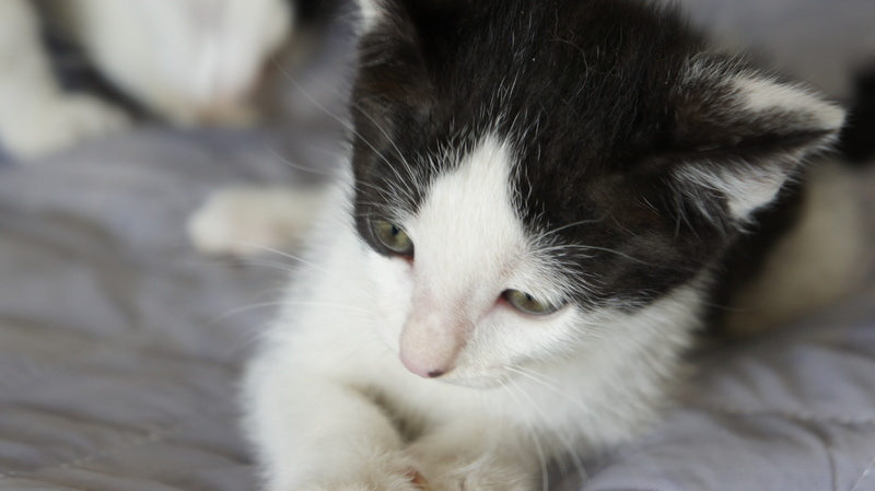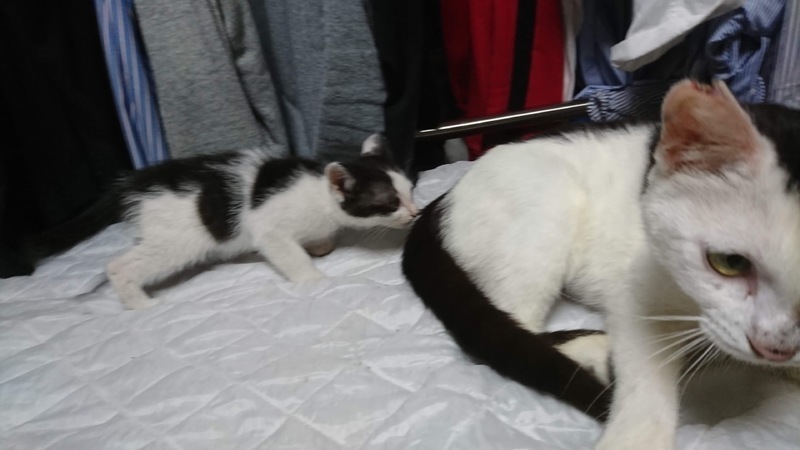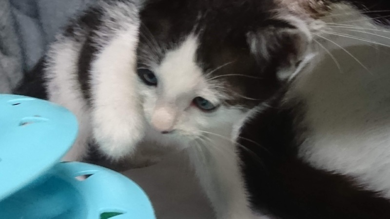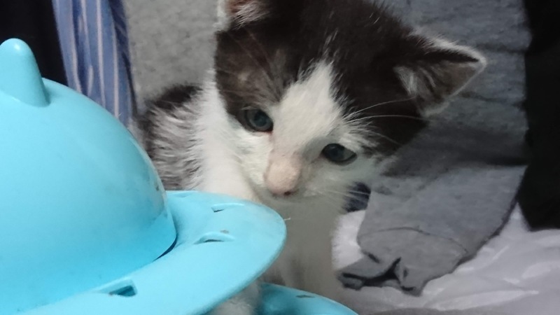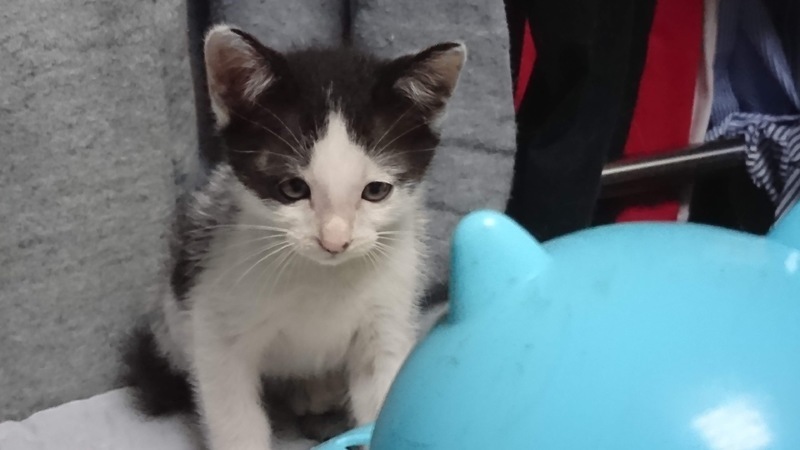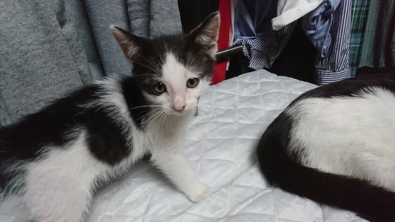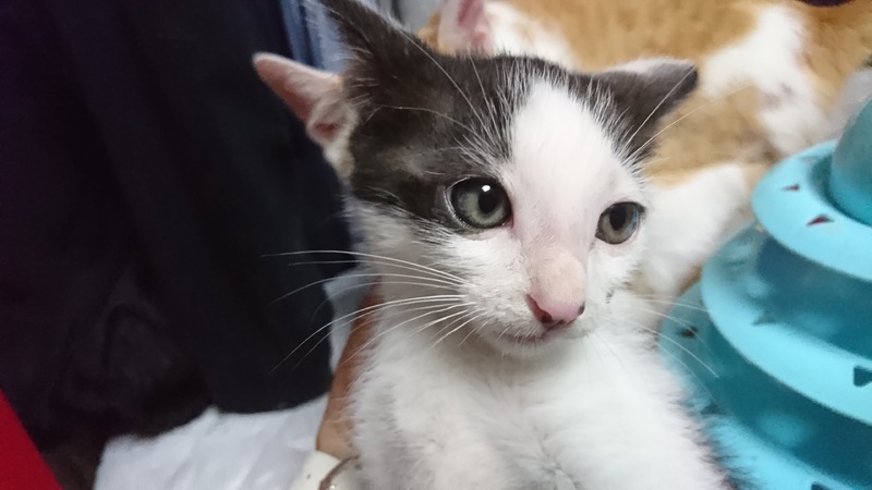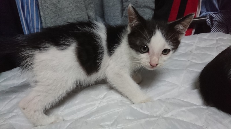 | 特徴(性格など) | 黒ブチ(ハチワレ)の元気な女の子です。 好奇心いっぱいで家中を駆けっこしています。 先住猫みんなへと遊んでます。 疲れ知らずの楽しい子です。 |