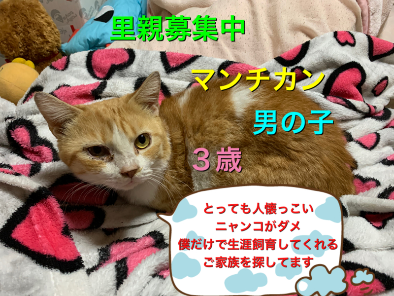 | 里親募集する理由 | 飼えなくなった方より保護しました。 他猫が一切ダメで、我が家には他にも保護した猫がいて喧嘩をしてしまうため。 |