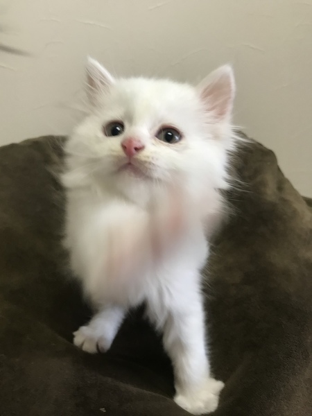 | 特徴(性格など) | 毛色:白 毛の長さ:中〜長 尻尾:真っ直ぐ 目の色:金 性格:やんちゃ、ちょっとシャイ |