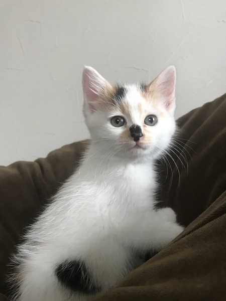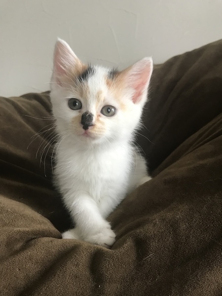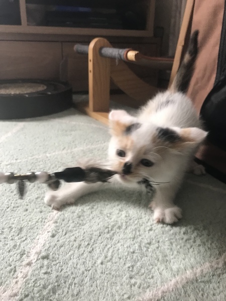 | 特徴(性格など) | 毛色:三毛(バンパターンくずれ) 毛の長さ:中 尻尾:真っ直ぐ 目の色:金 性格:遊び大好き。 人懐っこく抱っこも嫌がらない。 お腹を見せる。 おもちゃは咥えると離しません。 |