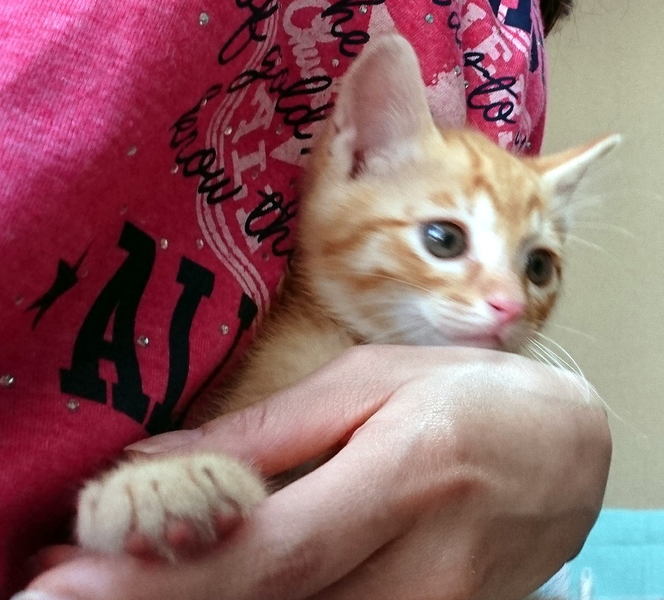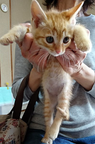 | 特徴(性格など) | チャトラの元気な子猫。 現在、別途で募集中の三毛猫ちゃんと一緒に生まれました。 今は保護主さん宅にいるのですが、生後約1か月ほどで性別がはっきりと判別しにくいとのことなので、 申し訳ありませんがオス・メスを問わないという方、お願いします。 三毛猫ちゃんとは一緒に元気いっぱいに遊んでいます。 1匹でももちろん可能ですが、兄妹一緒に引き取ってくださるかた、大歓迎です♪ |