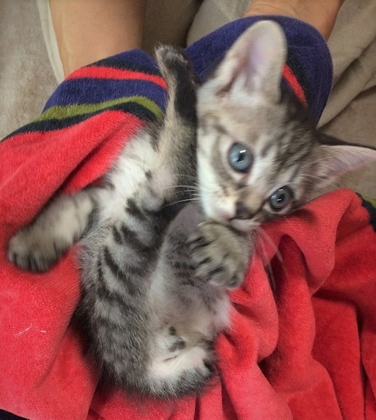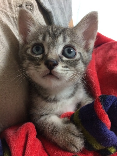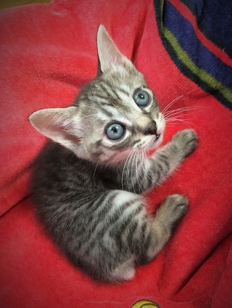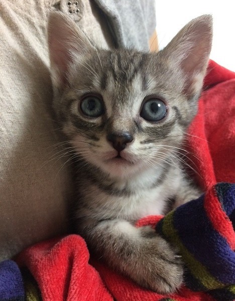 | 特徴(性格など) | 【猫の仮名】 ふうちゃん 【毛色・柄】 グレー縞柄(担当者 桂) ふわふわグレーの縞柄。 姉のソックスちゃんと毎日元気いっぱいに走り回って、遊んでいます。 保護主宅で生まれていますので、人慣れは抜群で、とっても甘えん坊さんです♡ 兄弟の臍の緒が巻きついてしまい、生後3日目に左後ろ足と尻尾を切断ました。 小さな体で麻酔にも耐え、あふれる生命力で、3本足の不便は感じられません。 できれば、姉のソックスちゃんと一緒に飼ってくださればありがたいです。 |
