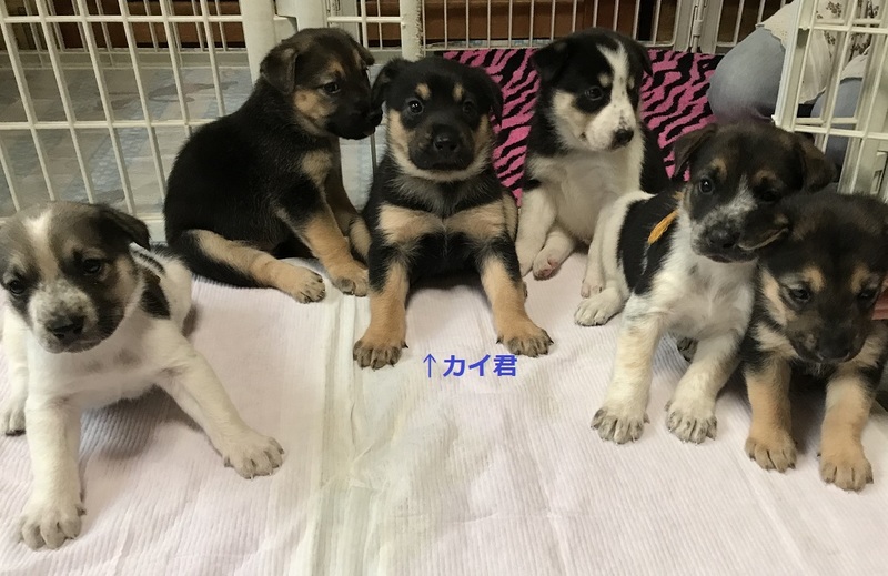| 特徴(性格など) | 黒×茶 短毛 ミックス犬 お母さんが25キロ以上なので、大型犬になると思います。 お父さん犬は不明です。 兄弟8匹すくすく成長中! その中でも、一番大きなカイ君。 でも、性格はおっとりしている・・・・と思います。 生涯室内飼育をお約束いただける方にお願いします。 現在1日4回食です。6時間以上のお留守番は難しいです。 |