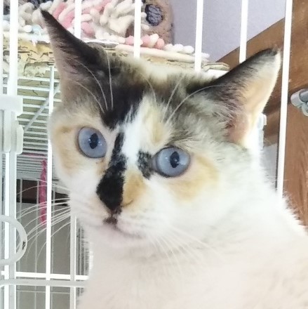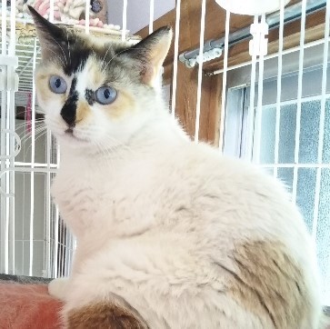 | 特徴(性格など) | ラグドール系かシャム系のミックスと思われるような毛色と、透き通る青い目がとても素敵な女の子です。過酷な外生活を経験してきたのでまだ人馴れができていません。落ち着いた性格なのでお留守番もしっかりできて、まったく手がかかりません。チュール大好き、おもちゃなどにじゃれてくれる無邪気な面もありますので、ゆっくり絆を深めて家族になってくださる方をお待ちしています! | ||