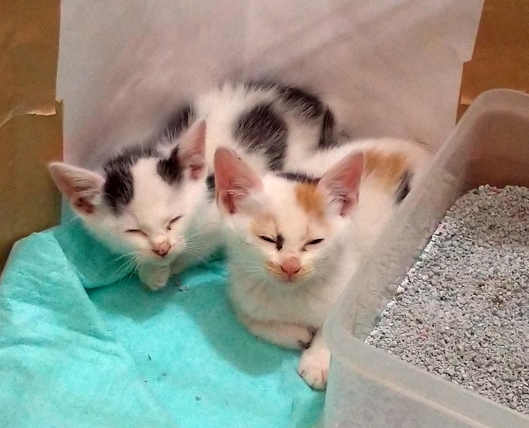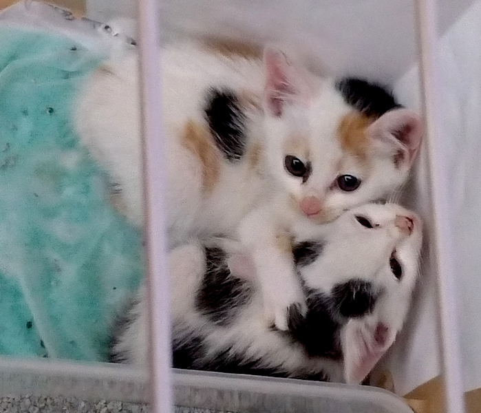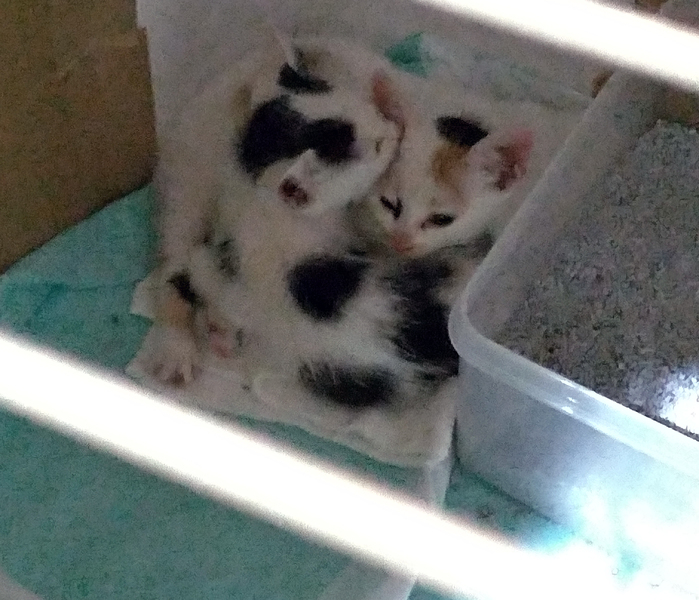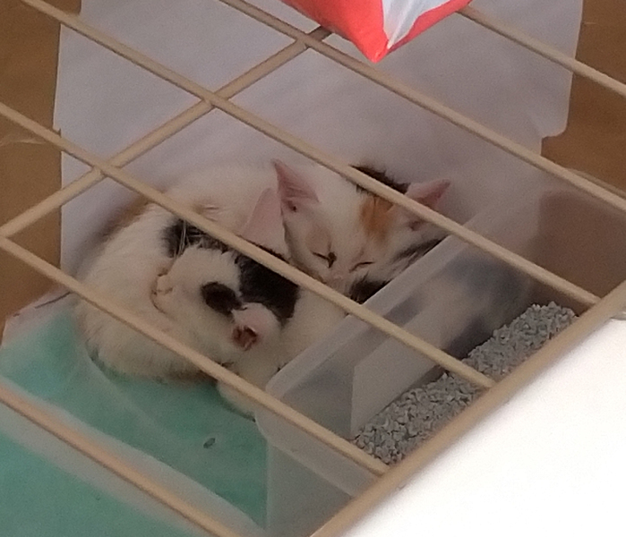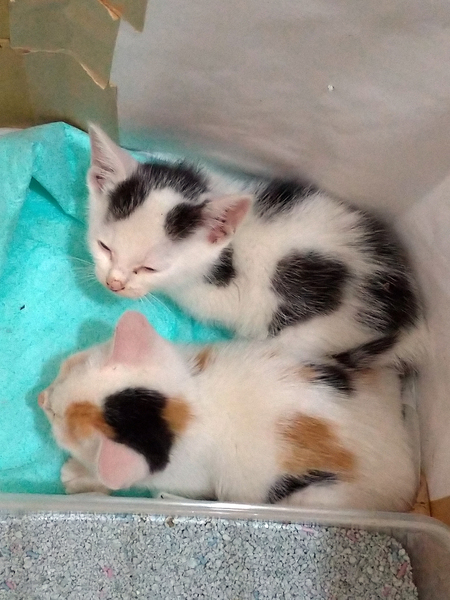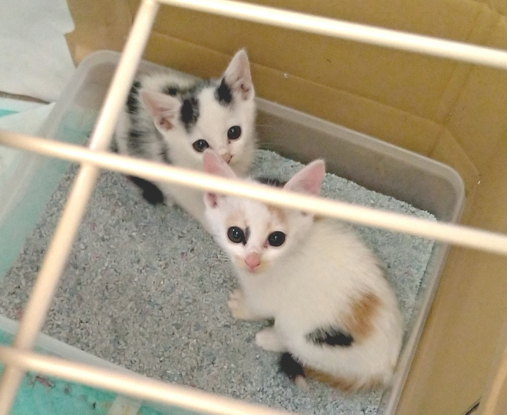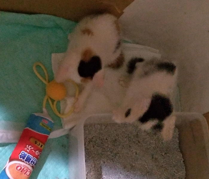 | 特徴(性格など) | きょうだいの子猫です。 ミケ:白が多めの三毛で、ちょっと変わった柄です。目の色は今は青みがかった濃い灰色です。おそらくメスです。とりあえずミケちゃんと呼んでいます。 陽気で、きょうだいやおもちゃにじゃれて遊ぶことが大好き。よくミルク+離乳食を食べ、よく運動し、よく寝ます。抱っこするとおとなしくしています。きょうだいと離れるとミャウミャウ鳴いて寂しがります。 ブチ:白が多めの乳牛のような珍しいブチ柄で、目の色は今は青みがかった濃い灰色です。おそらくオスです。とりあえずシロクロちゃんと呼んでいます。 ミケちゃんに比べると少し怖がりで、おっとりおとなしい性格です。抱き上げると一応フゥ~と威嚇しますが、引っ掻いたり噛んだりせずおとなしくしています。まだ離乳食を食べるのはあんまりうまくありません。毛糸玉のおもちゃが好きです。 保護した昨日から、トイレは猫砂のトイレで問題なく出来ています。いつも2匹で抱き合って重なり合っています。起きているときはおもちゃやお互いのしっぽにじゃれて遊んで、遊び疲れてミルクを飲んで、寝て、の繰り返しです。 |