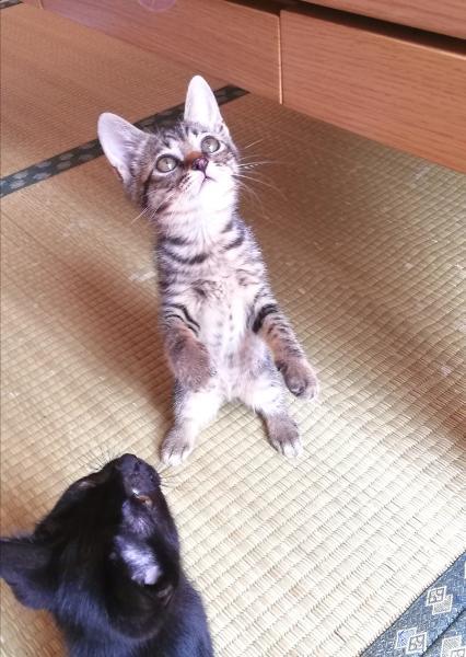 | 特徴(性格など) | 生後2ヶ月ほどになるキジと黒の姉妹猫ちゃんです。 快活な猫ちゃん達でよく馴れています。 猫じゃらしで遊んであげると夢中になって遊び、すごく喜びます。 キジちゃんと黒の1匹はタッチができます。 もう一匹の黒猫ちゃんはおとなしめですが、自分も加わって馴染んでいるつもりなところがかわいいです。 保護当時風邪をひいていましたので、治療を継続しています。 だいぶ良くなってきました。 今はよく食べ、よく遊び、元気一杯です。 |