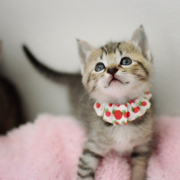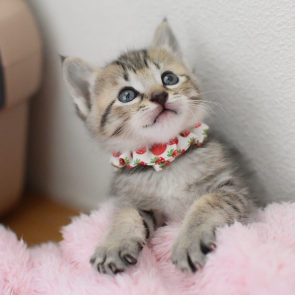 | 特徴(性格など) | 仮名は【風華:ふうか】といいます キジトラ、フルテイル、つぶらな瞳がかわいい美猫さん 生後1週間からミルクで育てていますのでニンゲン大好き甘えん坊さん このこはおっとりぽわんぽわんさんタイプです *生後1ヶ月 *エイズ白血病マイナス *便検査、駆虫すみ |
