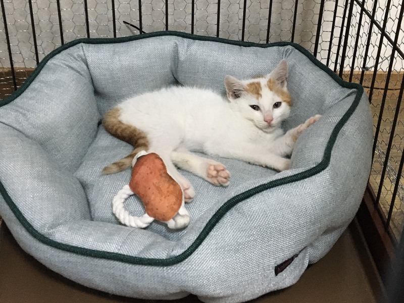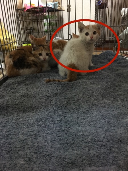| 特徴(性格など) | 野良ちゃんの子どもなのでビビリちゃんではありましたが今ではだんだんと慣れ、手からご飯を食べたり撫でると喉をゴロゴロならしたりとリラックスした様子も見受けられます( ´∀`) 色は白に少し茶色が入っています。 お母さん猫に似てとても可愛い顔をしています。イケメンくんです⭐︎ |