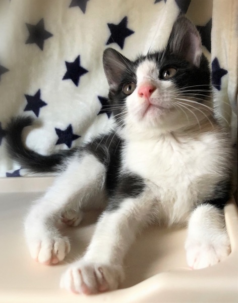 | 特徴(性格など) | 仮名、ムック 少し長めの被毛・ハチワレ男の子。 初めての場所では、緊張してシャーっと言ってしまいますが、おもちゃを出すと夢中で遊び始めます。 数日で、撫でるとゴロゴロ+コテンと横になる甘えん坊です。 |