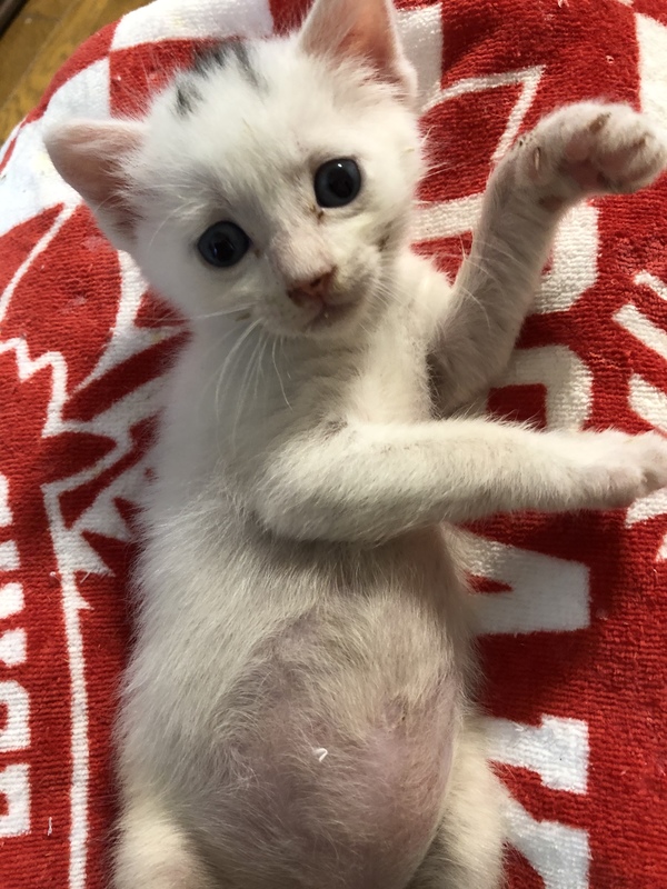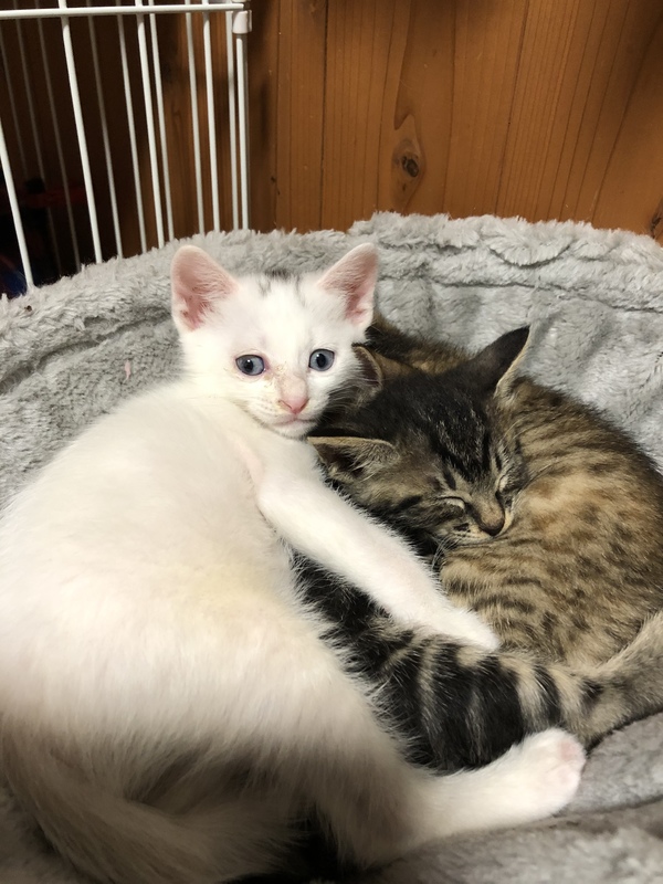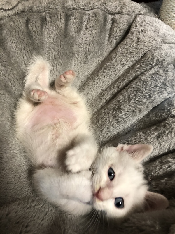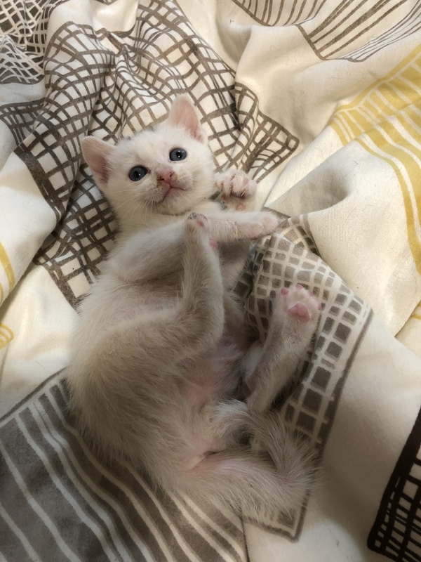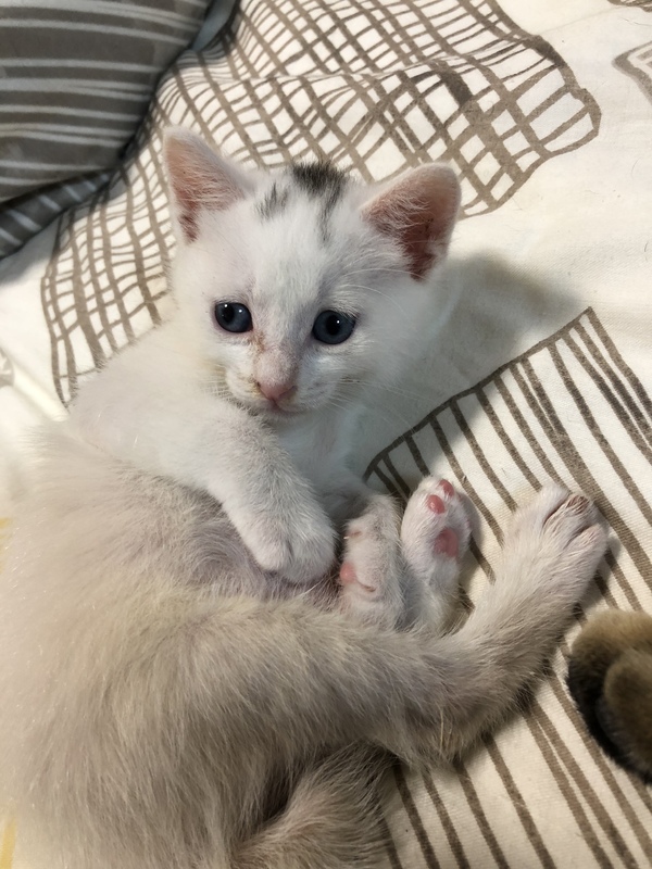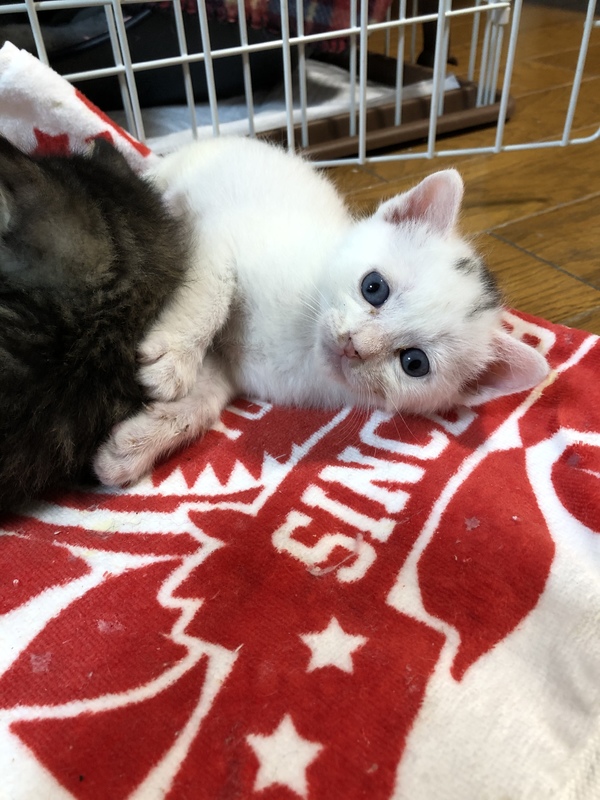 | 特徴(性格など) | 身体は真っ白ですが頭に少し黒い柄があります。尻尾はくの字に曲がってます。おっとりの甘えん坊。兄弟で唯一の男の子で身体は大きいですが何かできるようになるのは1番遅いマイペースです。最近やっとおもちゃやごはんに反応するようになりましたがまだミルクを欲しがり哺乳瓶で飲んでいます。物心ついた時から人間に育てられたのでとても人懐こいです。先住猫とも一緒に過ごしているため猫ちゃんも大丈夫です。 | ||