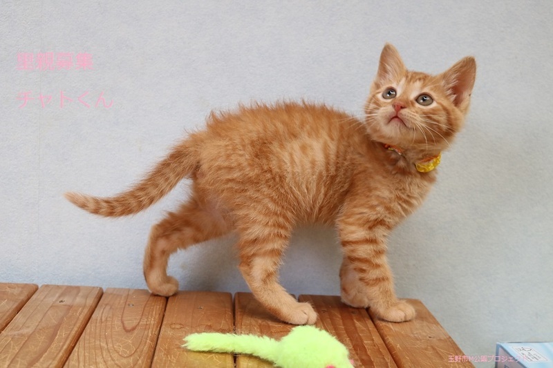 | 特徴(性格など) | 茶トラ子猫、男の子、仮名:チャトくん 推定生後2ヵ月くらい、体重:460g(6/10現在)、 健康診断済み、駆虫済み(ブロードライン6/19)、 血液検査、ワクチン接種は、体重が1kgになりましたら実施。 トイレしつけ済み。 甘えん坊の元気なチャトくん。 好奇心旺盛で賢い子です。 6/24、ウイルス検査-エイズ・白血病-ともに陰性。 6/24、初回三種混合ワクチン接種済み。 |
