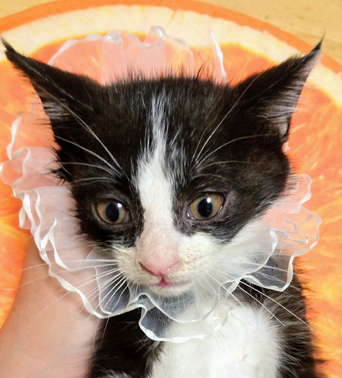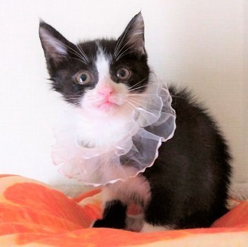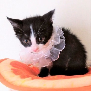 | 特徴(性格など) | 怖いもの知らず、とっても元気な男の子で、自己主張も強いと思います。 黒白ですが、右手は黒、左手は白、足は指なしソックス?の不思議な柄です。 しっぽは長くてまっすぐで、先だけ白いです。 |